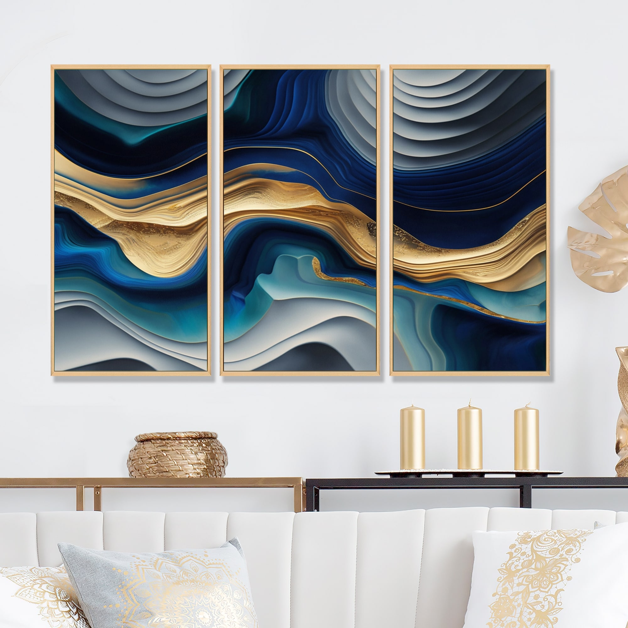 Designart "Blue and Gold Marble Agate Ripples II" Glam Framed Art Set of 3 - 4 Colors of Frames