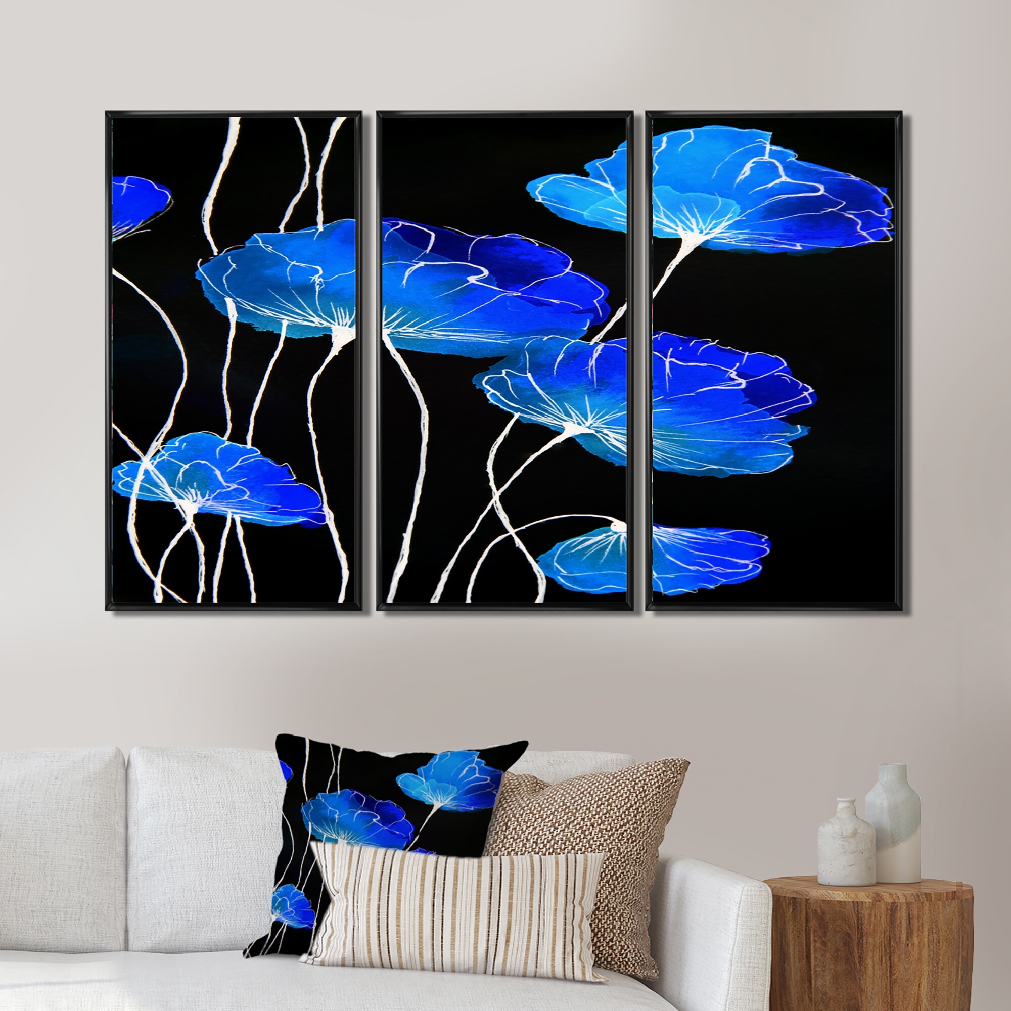 Designart "Detail Of Blue Flowers on Black II" Traditional Framed Wall Decor Set of 3 - 4 Colors of Frames