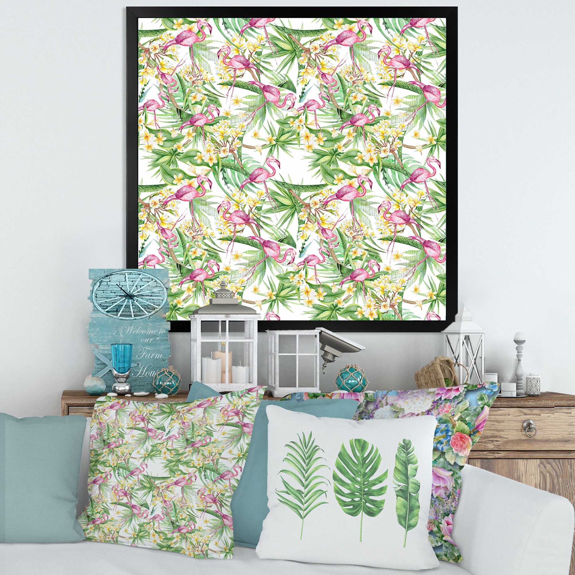 Designart "Tropical Foliage, Yellow Flowers With Flamingo II" Modern Framed Art Print