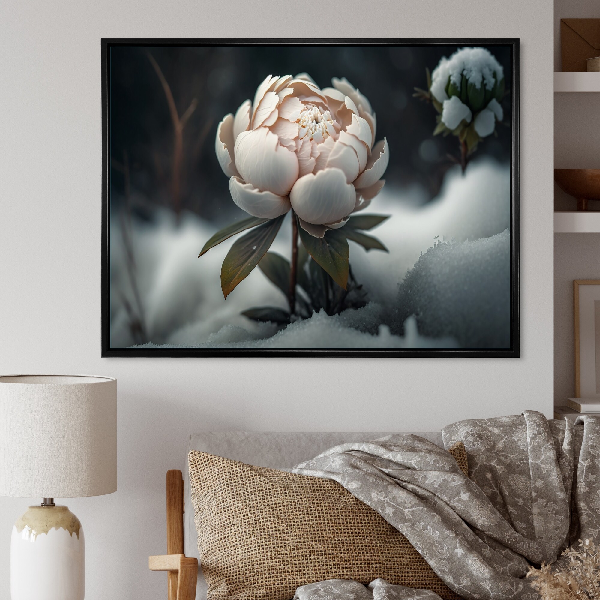 Designart "A Blooming White Peony Flower in Winter I" Floral & Botanical Framed Canvas Art Print
