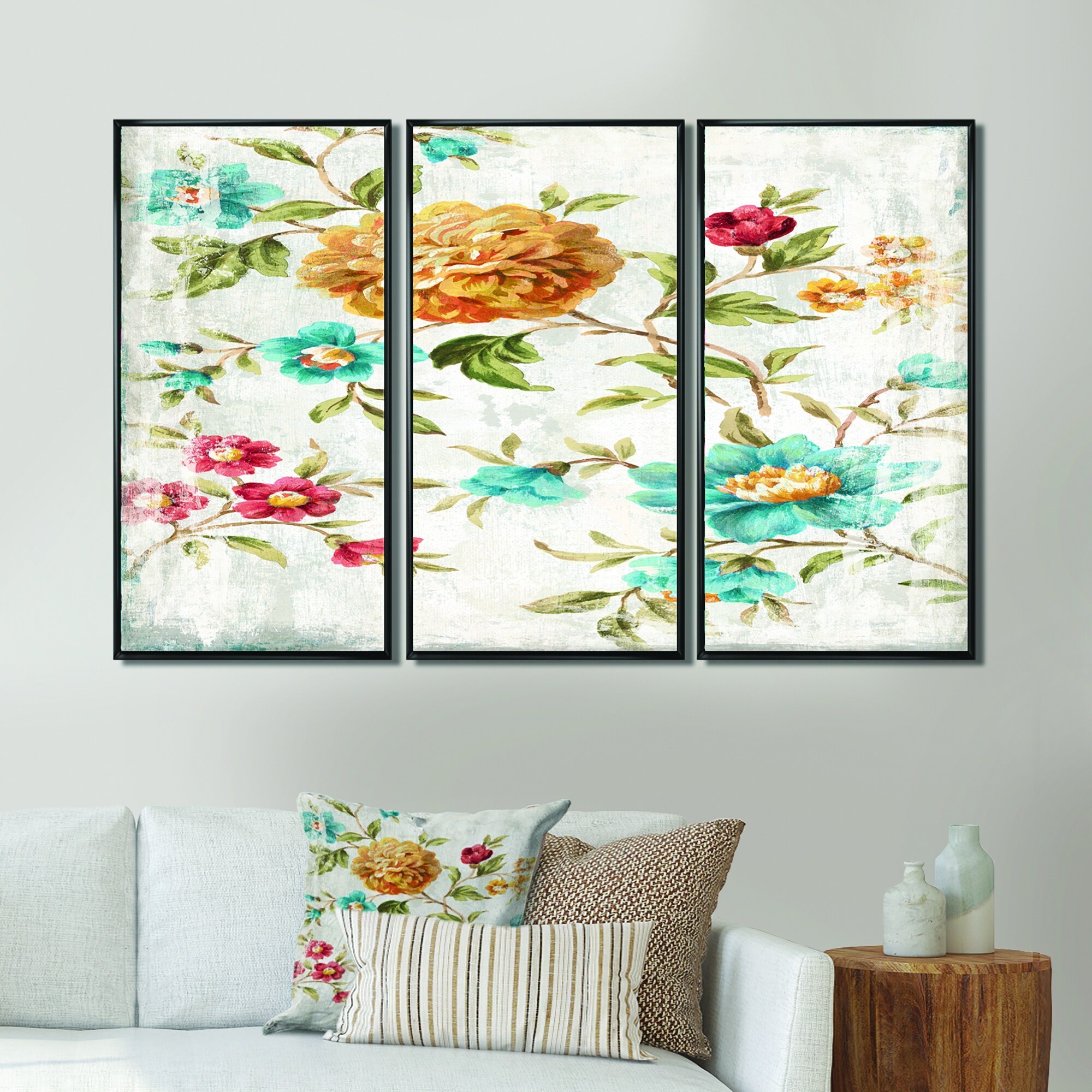 Designart "Golden Flowers" Cabin & Lodge Framed Canvas Wall Art Print Set of 3 - 4 Colors of Frames