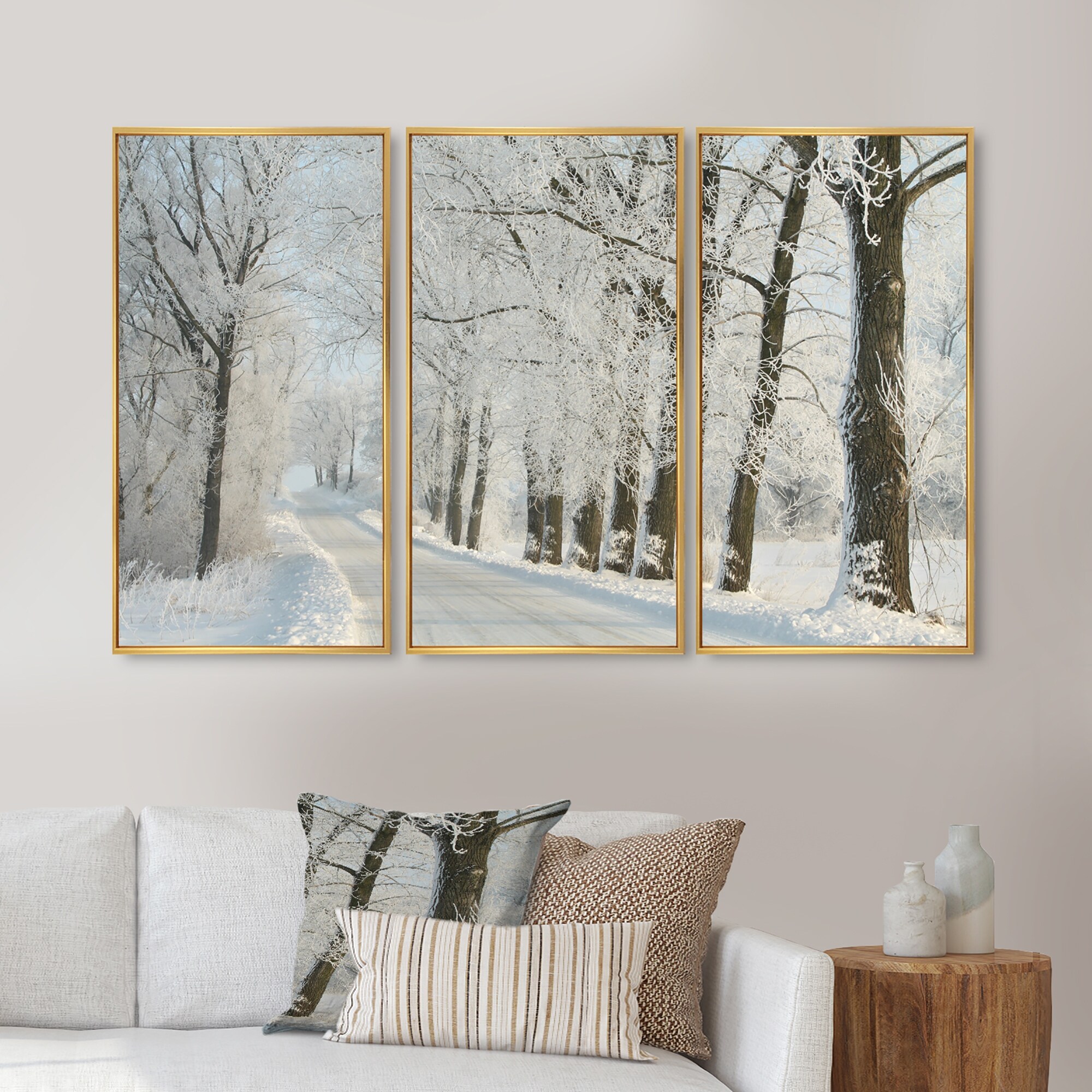 Designart "Snowy Road in Rural Winter Landscape" Traditional Framed Canvas Wall Art Print Set of 3 - 4 Colors of Frames