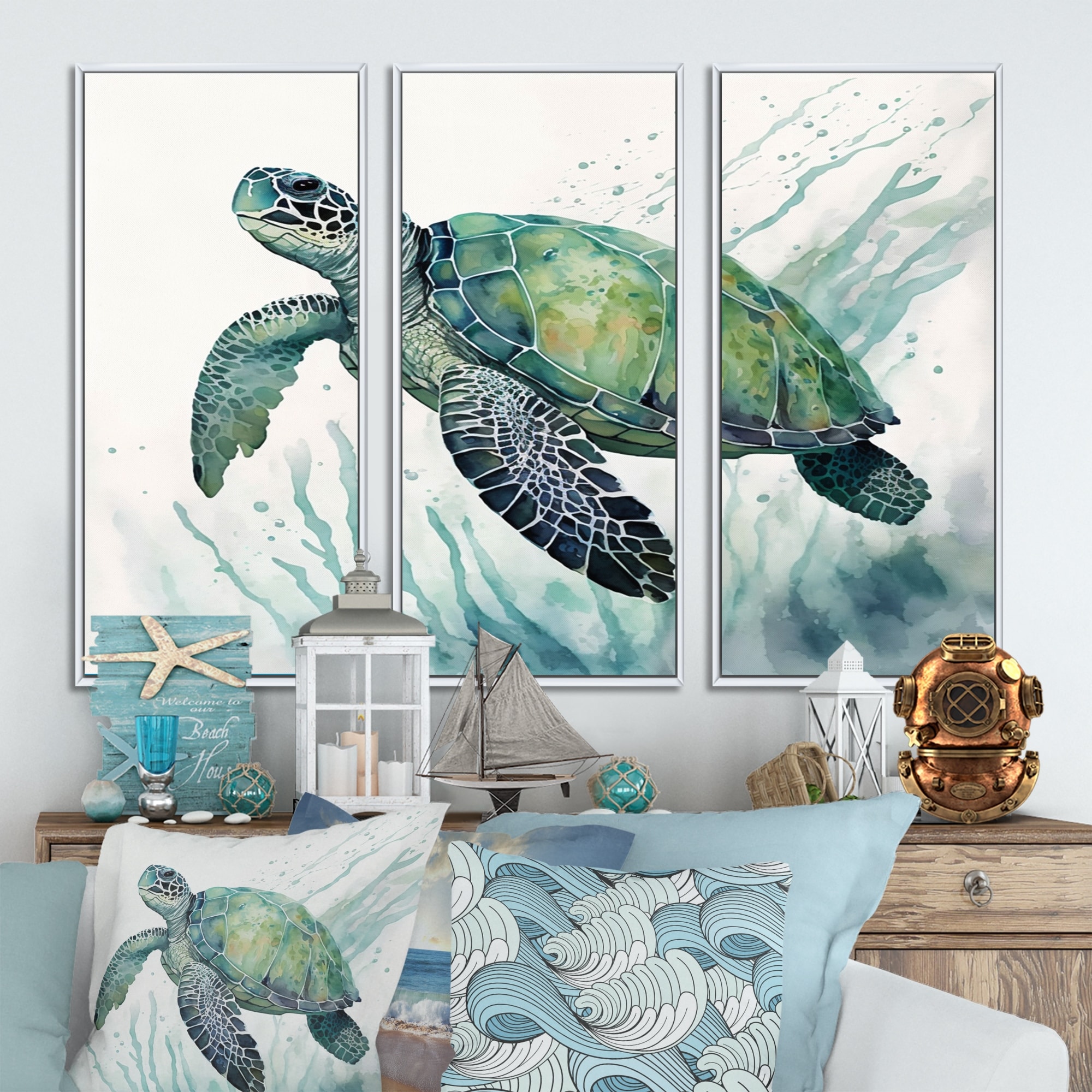 Designart "Watercolor Turtle Swimming IV" Animals Turtle Framed Canvas Wall Art Print - 3 Panels