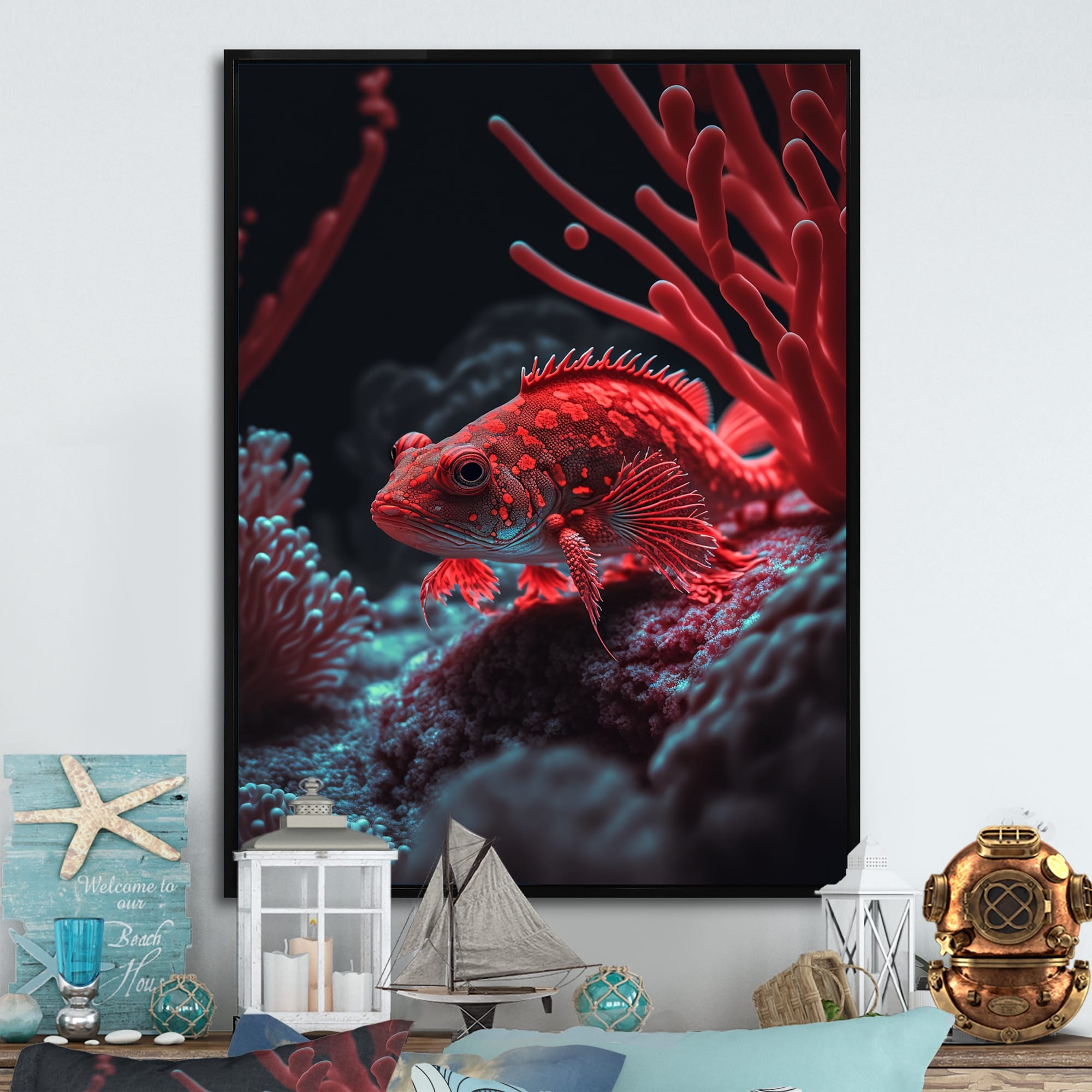 Designart "Tropical Fish in Shades of Red And Blue II" Animal Fish Framed Canvas Wall Art Print