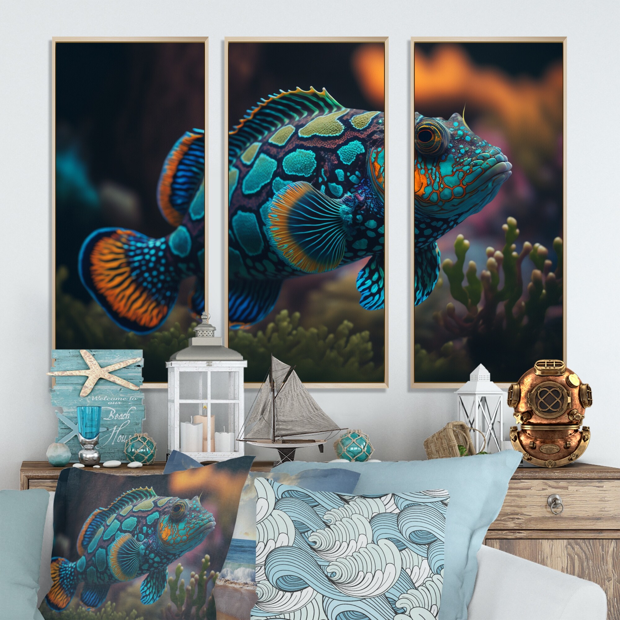 Designart "Beautiful Mandarin Fish in Shades of Blue II" Animal Fish Framed Canvas Wall Art Print - 3 Panels