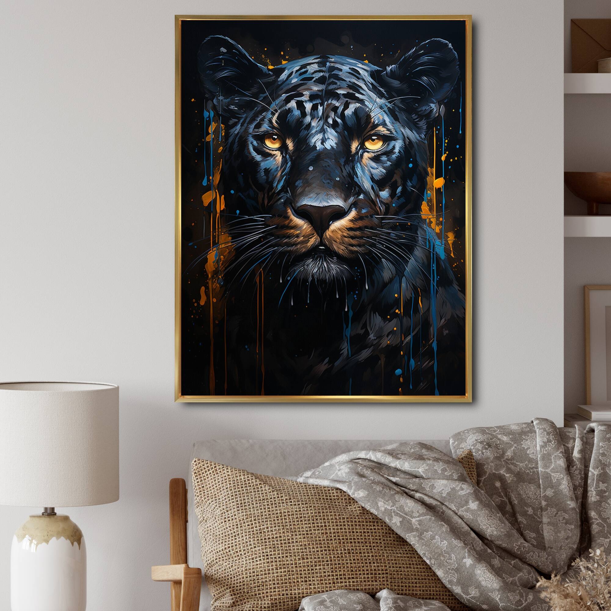 Designart "Teal Yellow Midnight Panther Inky II" Animals Panther Framed Wall Art Living Room