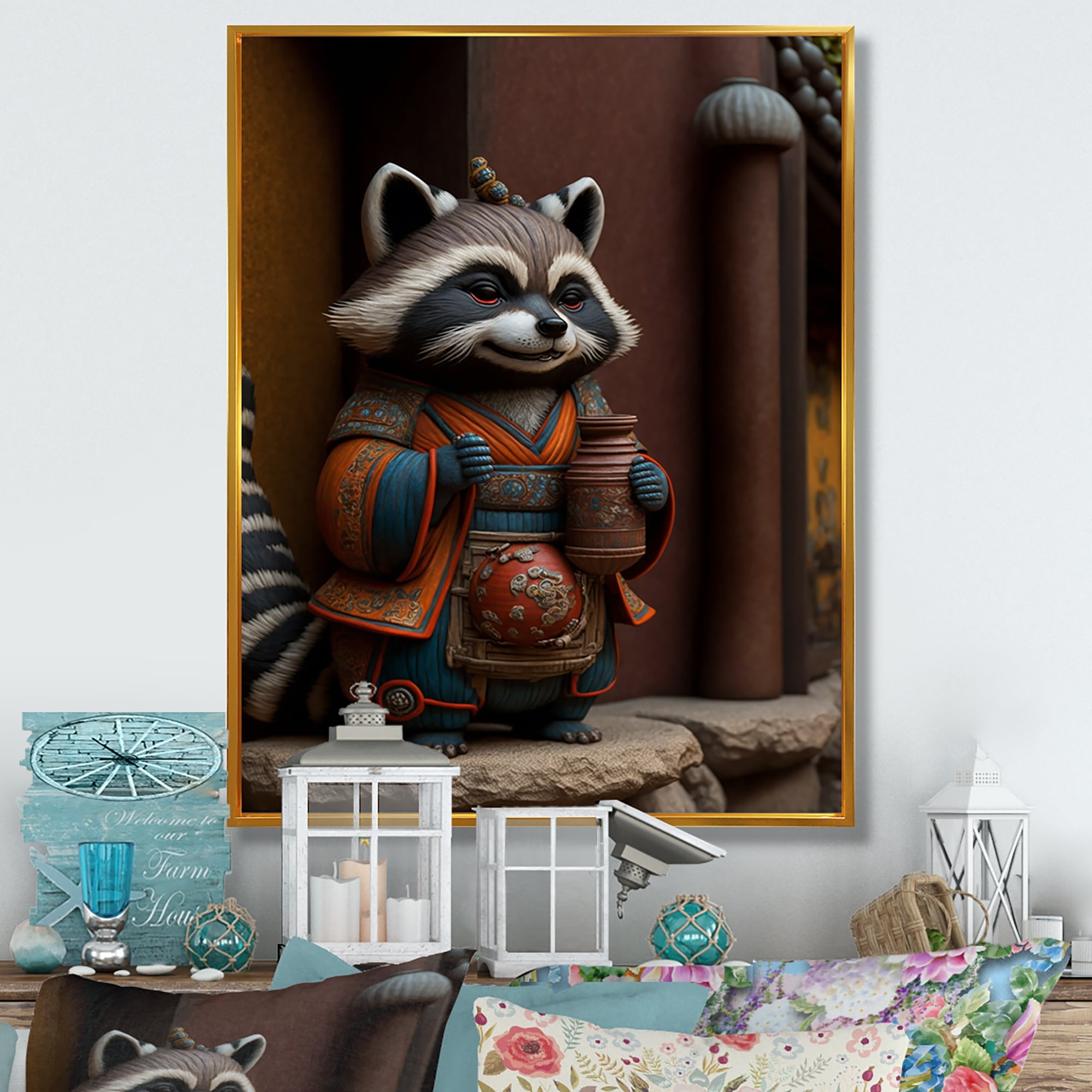Designart "Happy Terracotta Tanuki I" Animals Raccoon Framed Canvas Wall Art Print