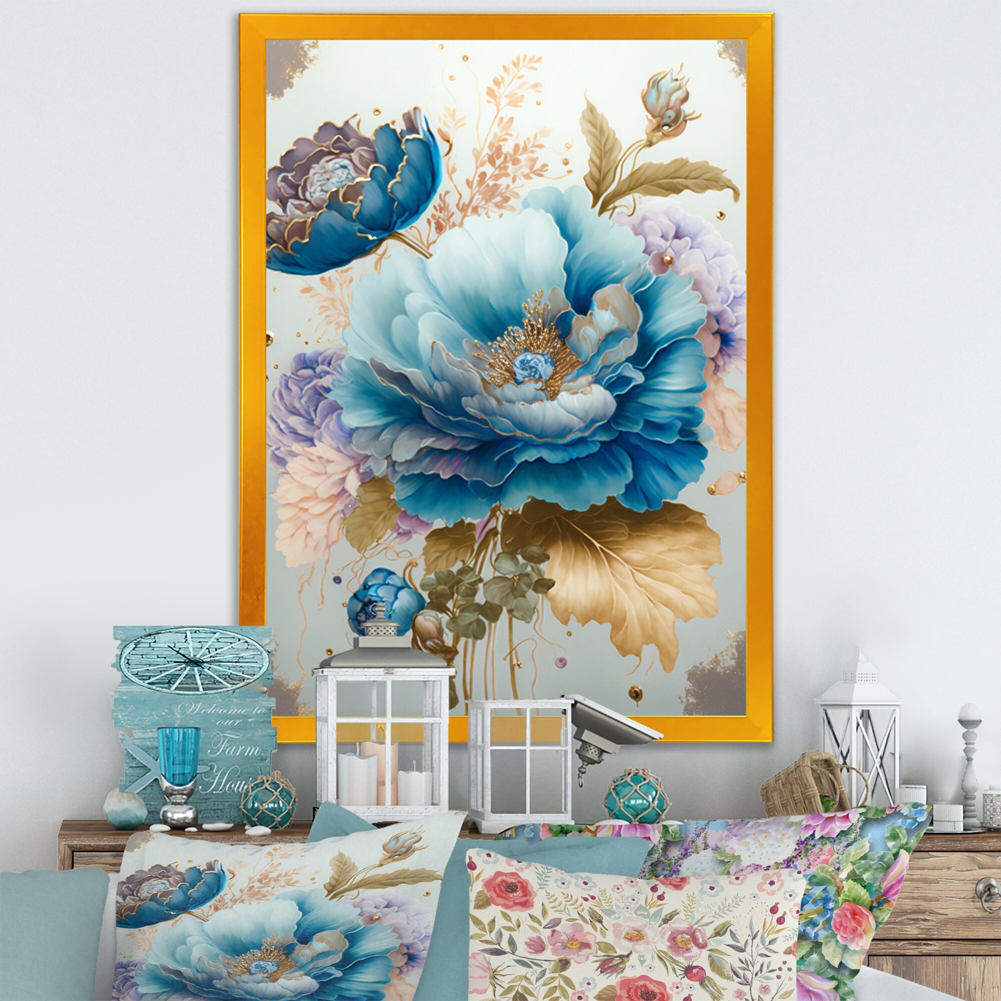 Designart "Golden Blue Flower Arrangement II" Floral & Botanical Framed Canvas Art Print