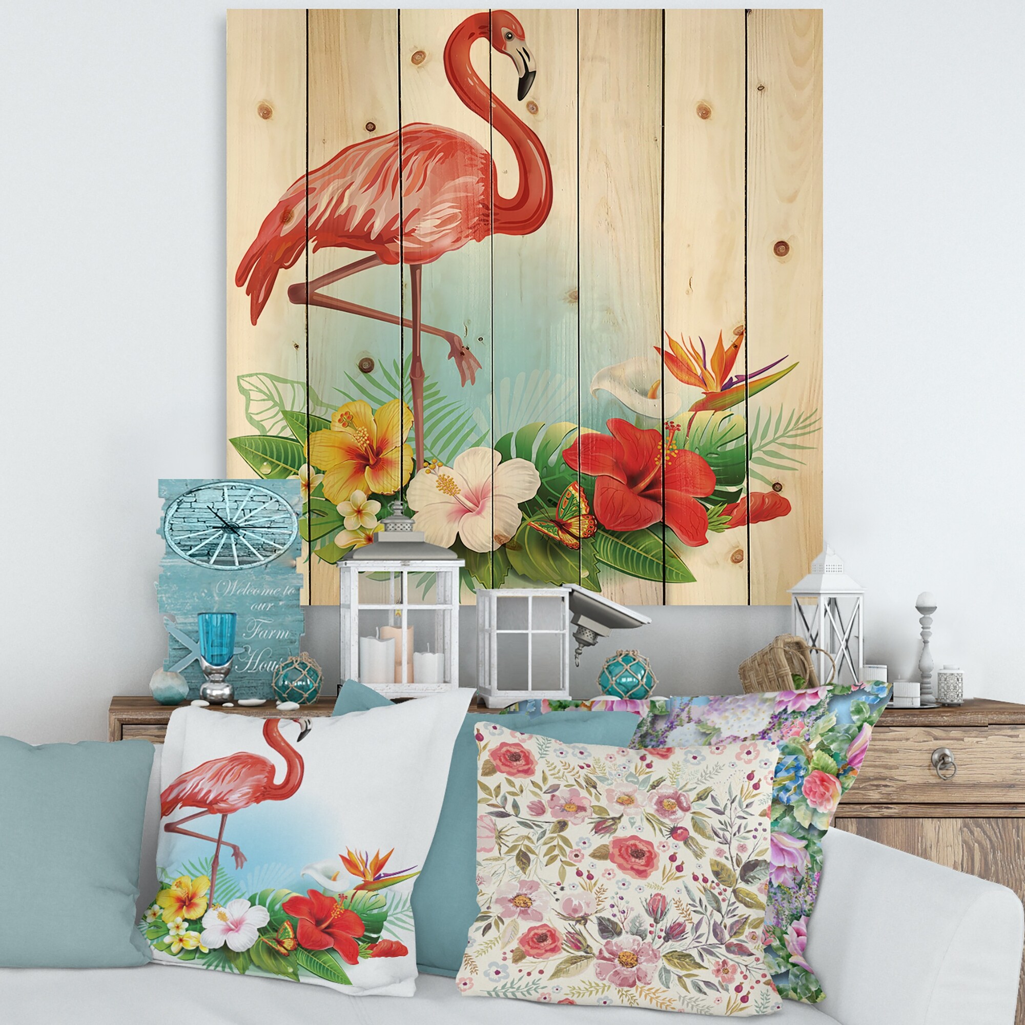 Designart 'Arrangement with Tropical Flowers and Flamingo' Traditional Print on Natural Pine Wood