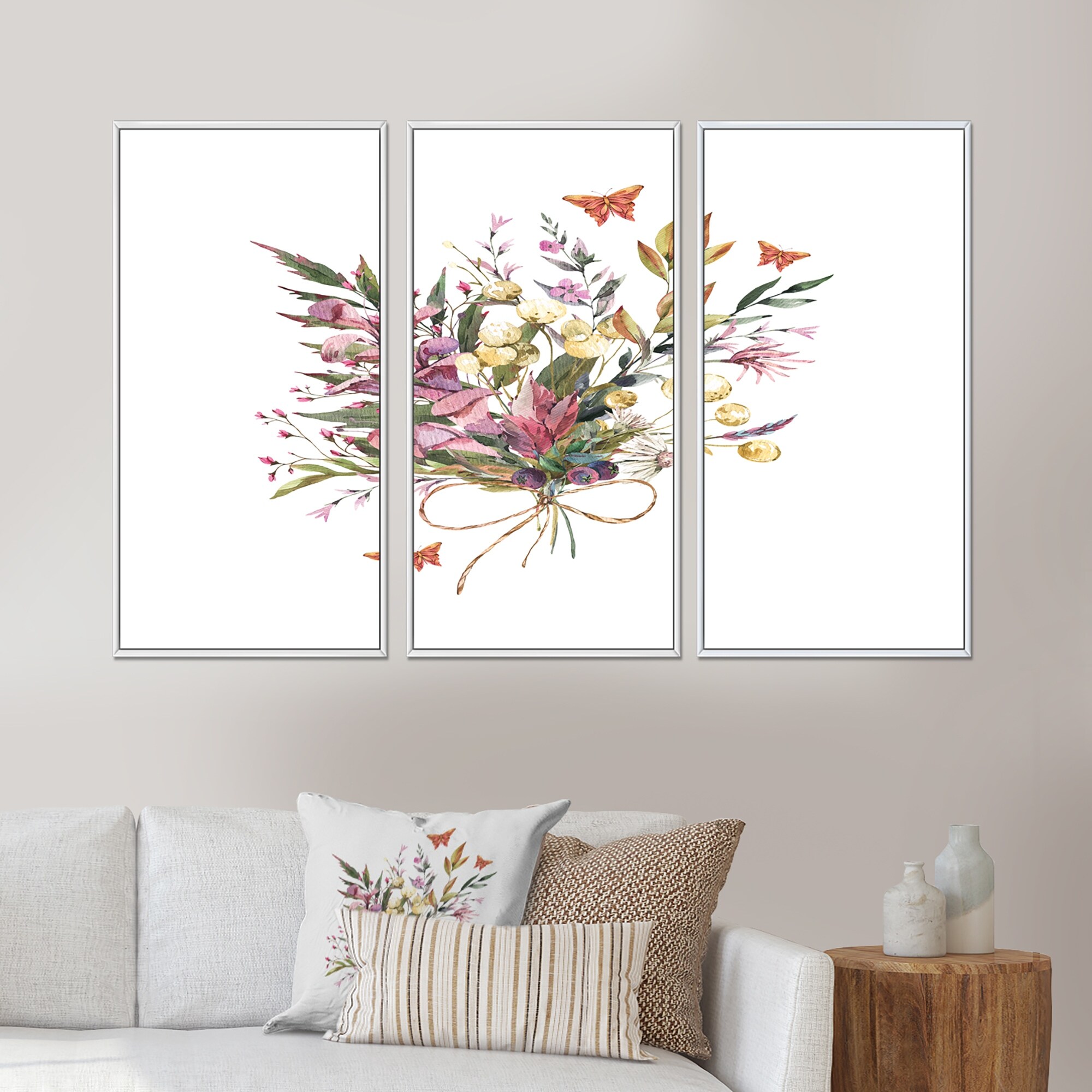 Designart "Vintage Floral Summer Wildflowers Arrangement" Traditional Framed Wall Decor Set of 3 - 4 Colors of Frames