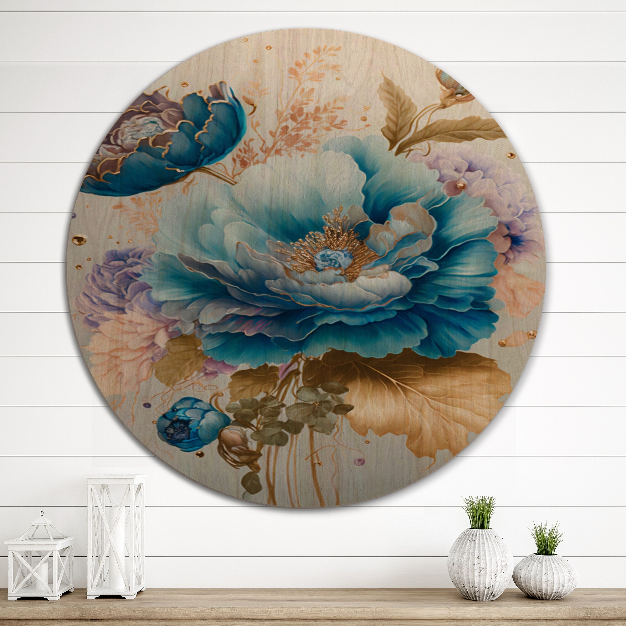 Designart "Golden Blue Flower Arrangement I" Traditional Wood Wall Art - Natural Pine Wood