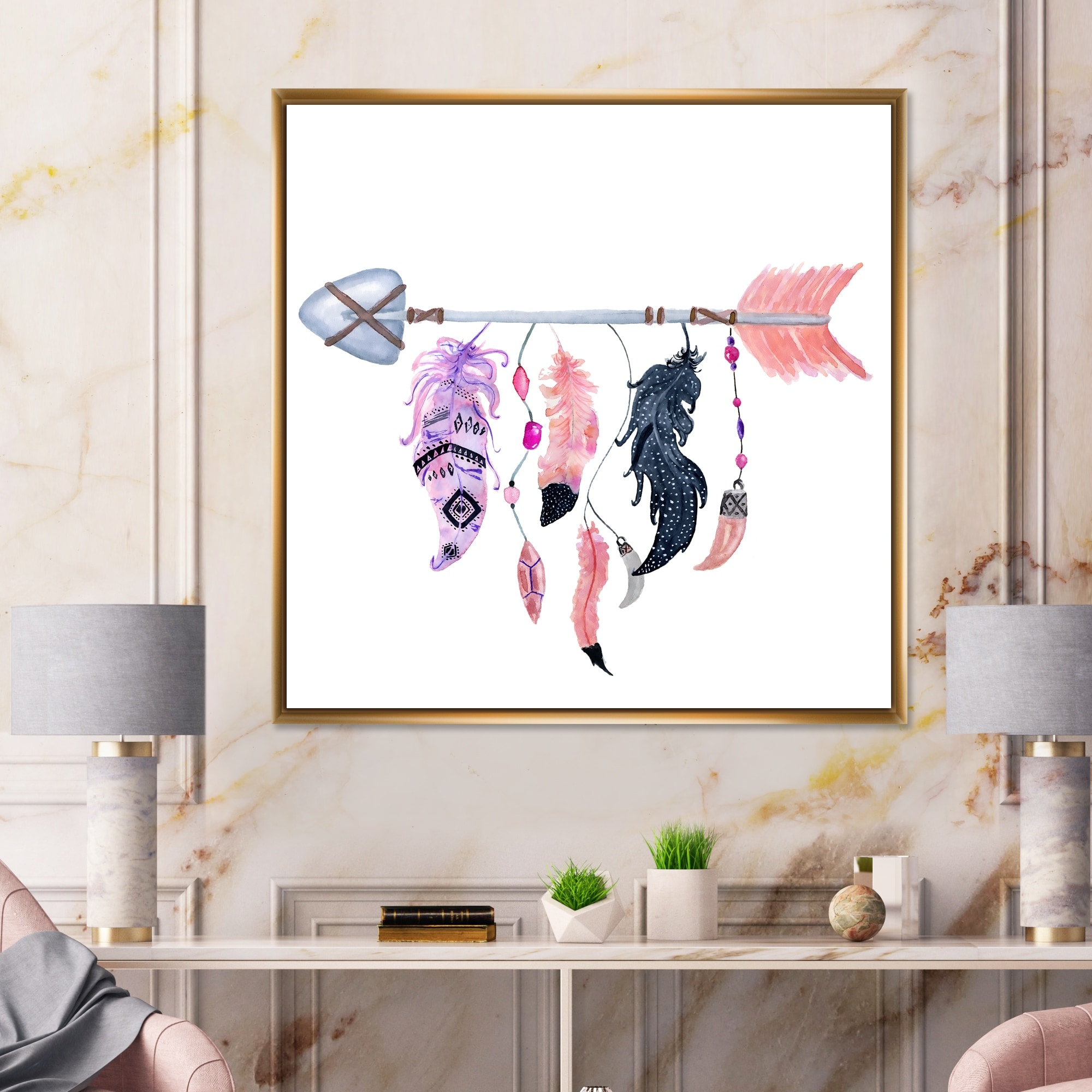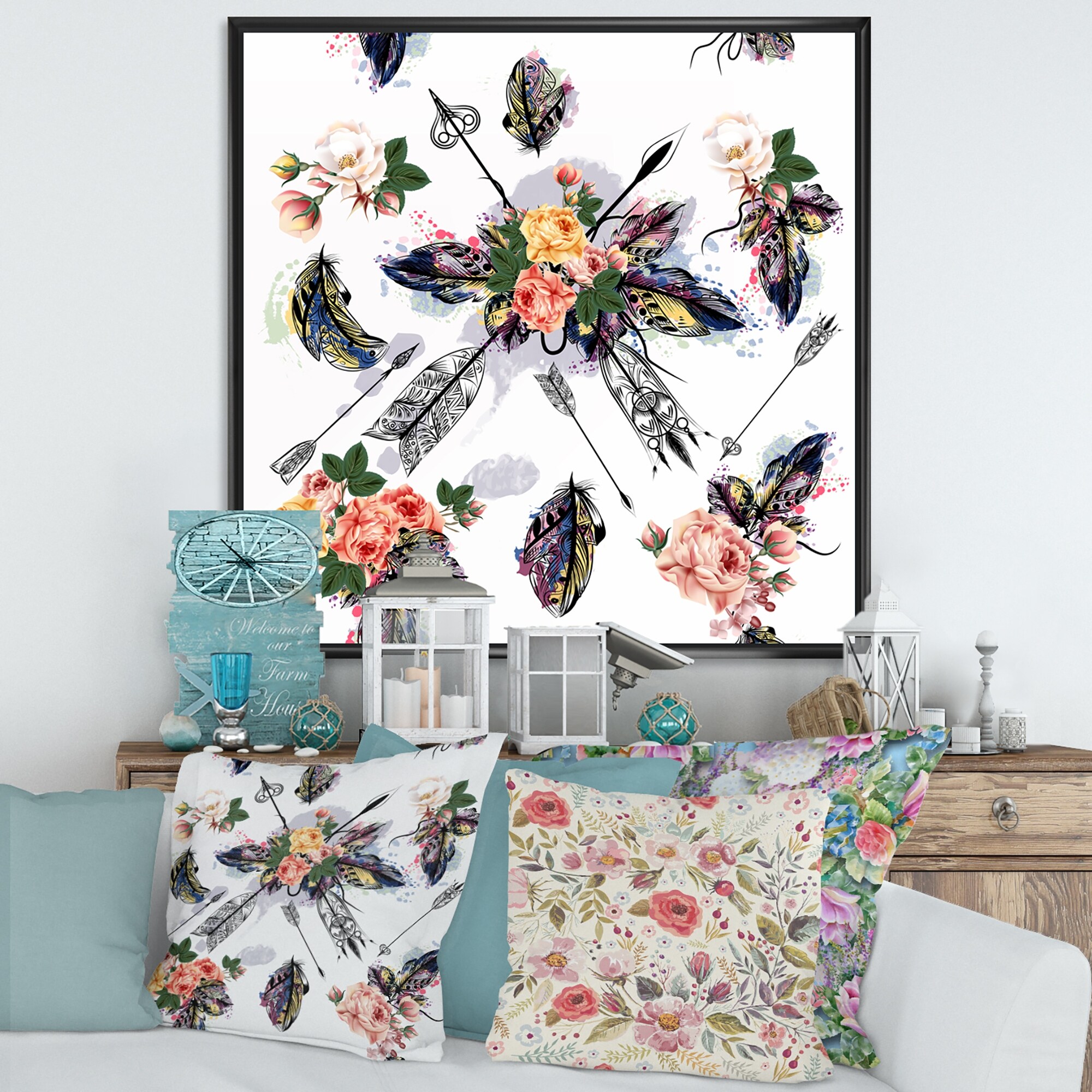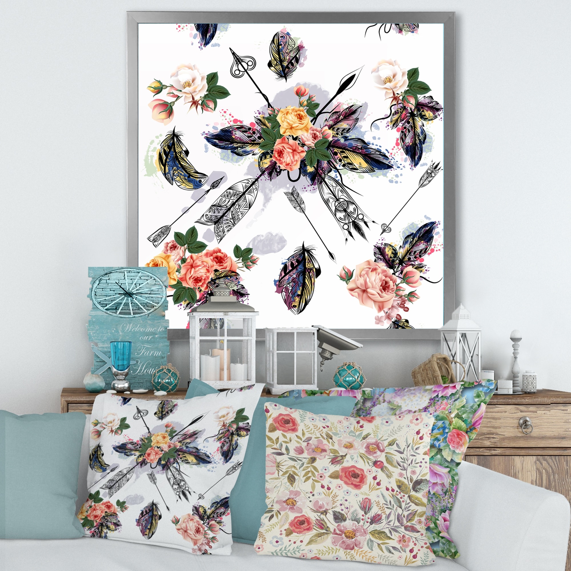 Designart "Ethnic Feathers and Flowers on Native Arrows I" Bohemian & Eclectic Framed Canvas Wall Art Print