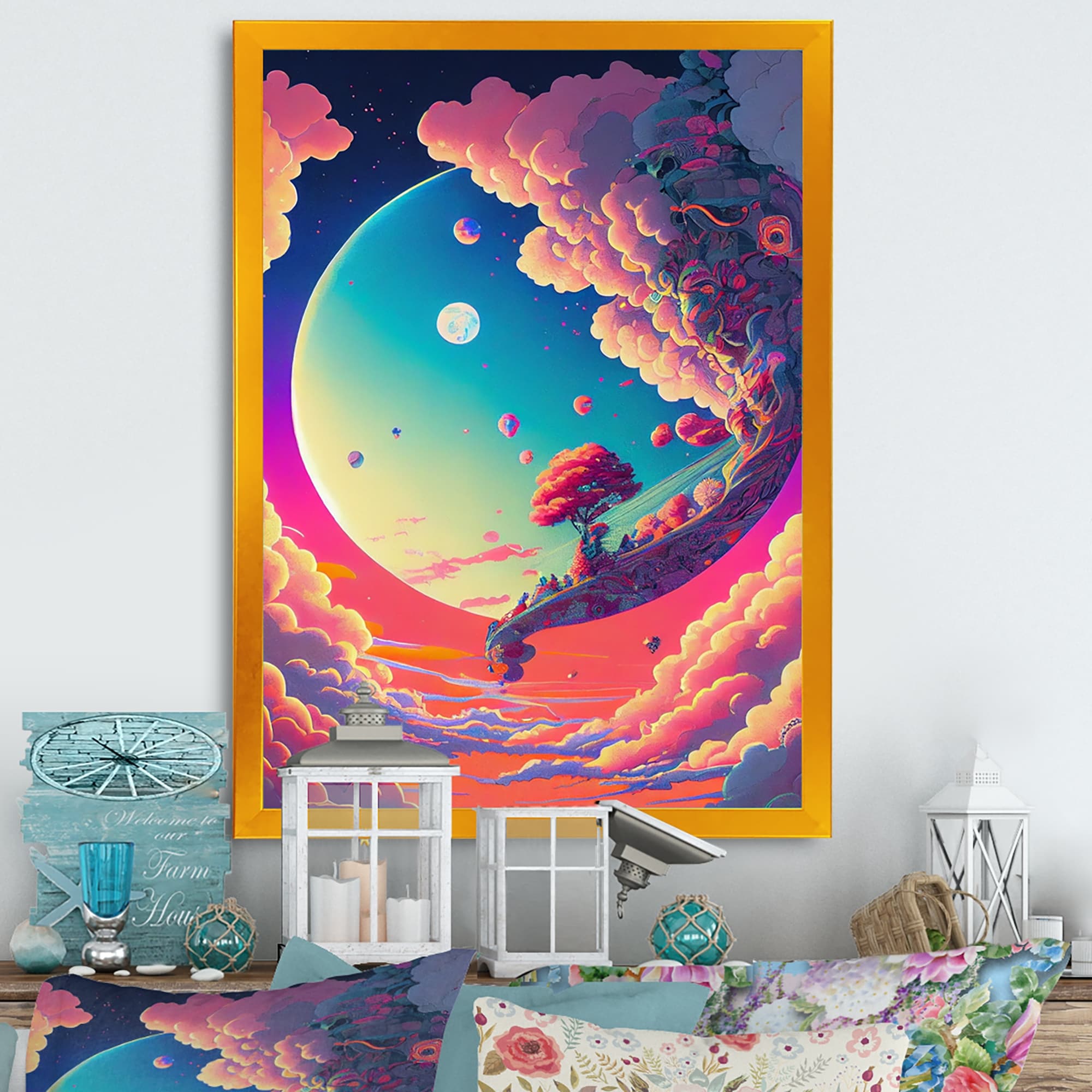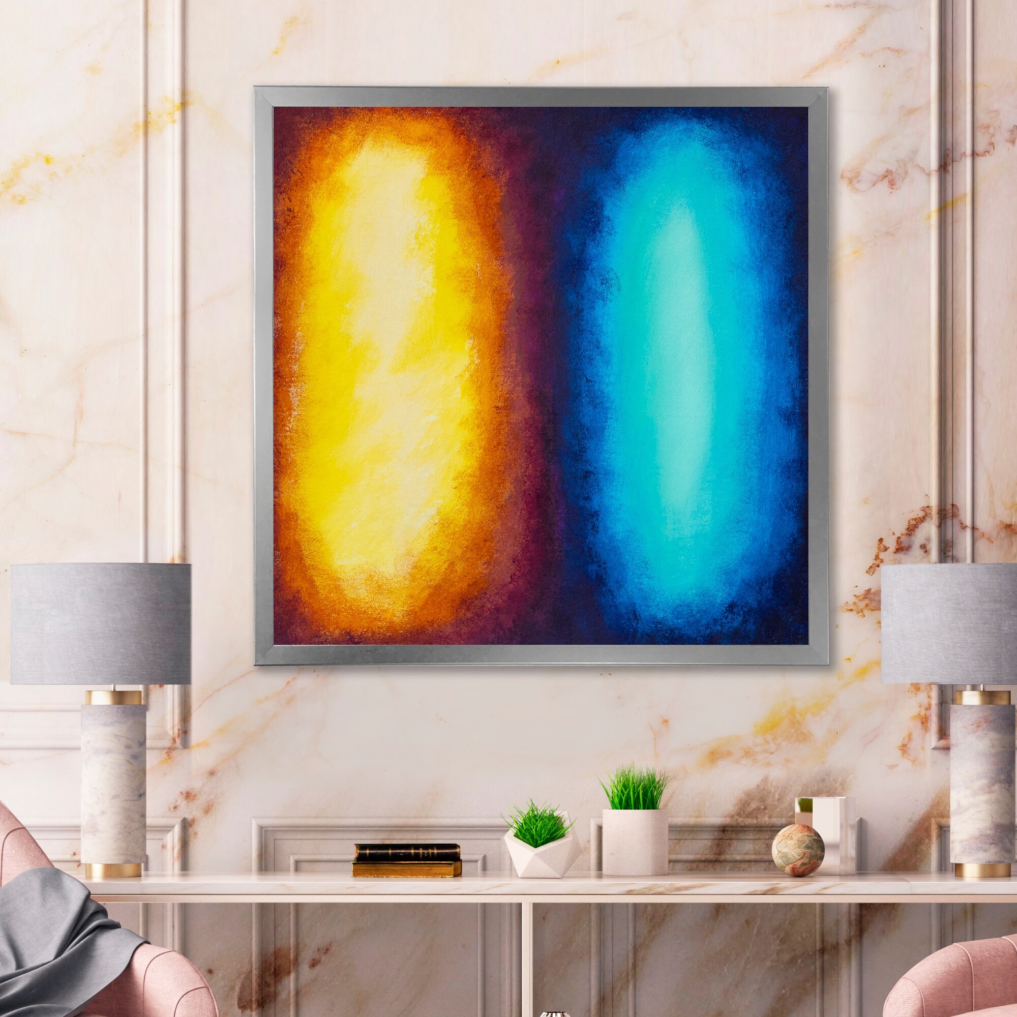 Designart "Yellow And Blue Light Bodies" Modern Framed Wall Art