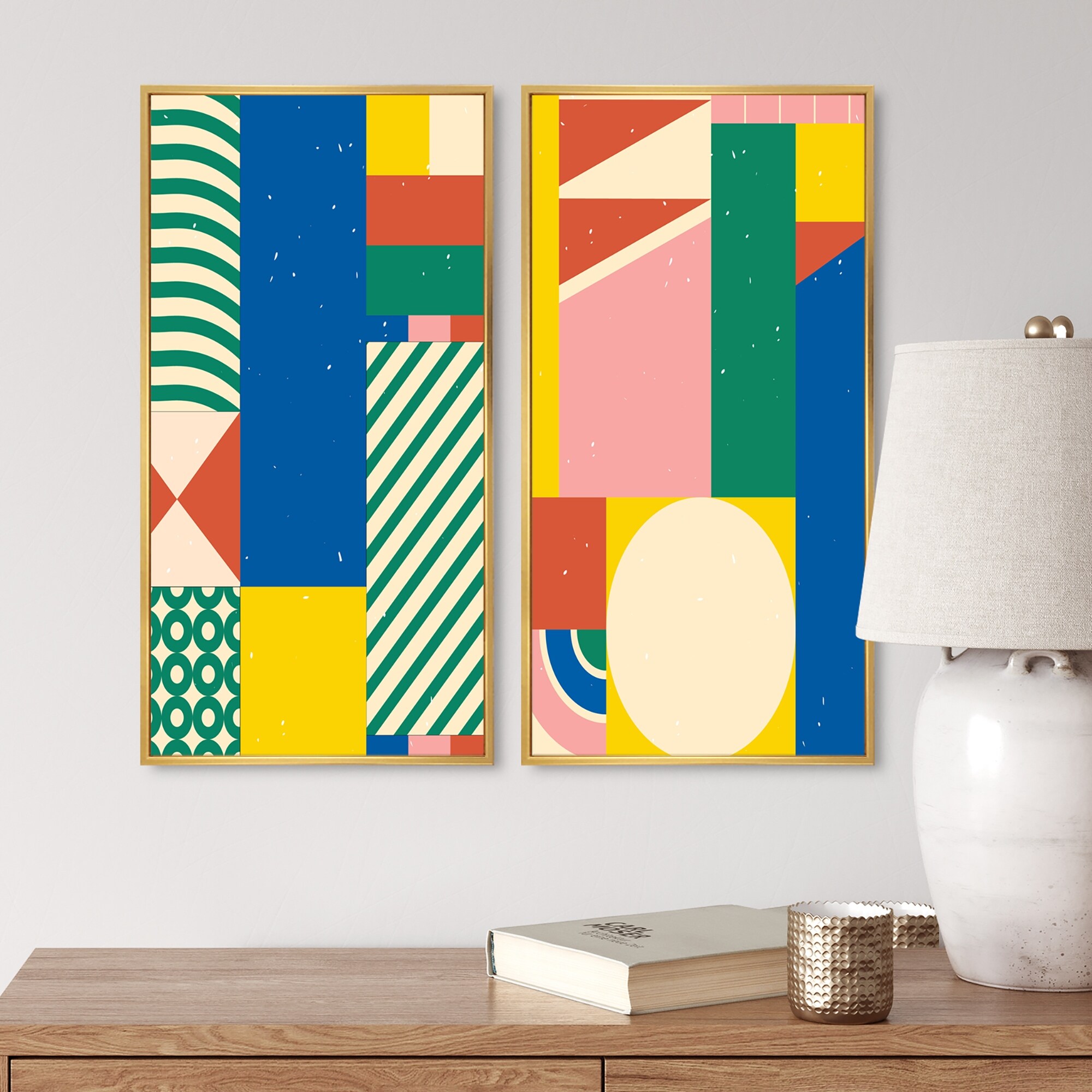 Designart "Retro Abstract Minimal Colorful Geometrics I" Abstract Framed Art Set of 2 Pieces