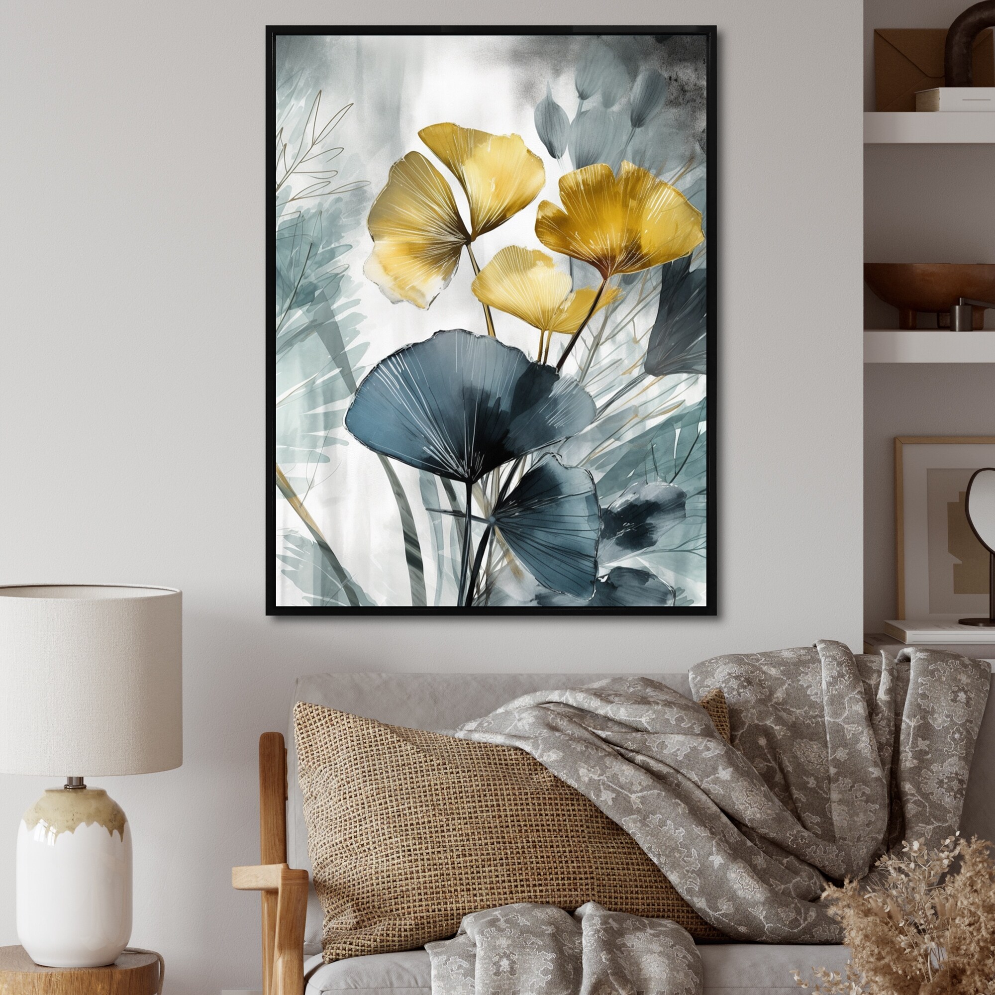 Designart "Palm Tropical Ginkgo Artwork I" Floral Leaves Framed Canvas Art Print