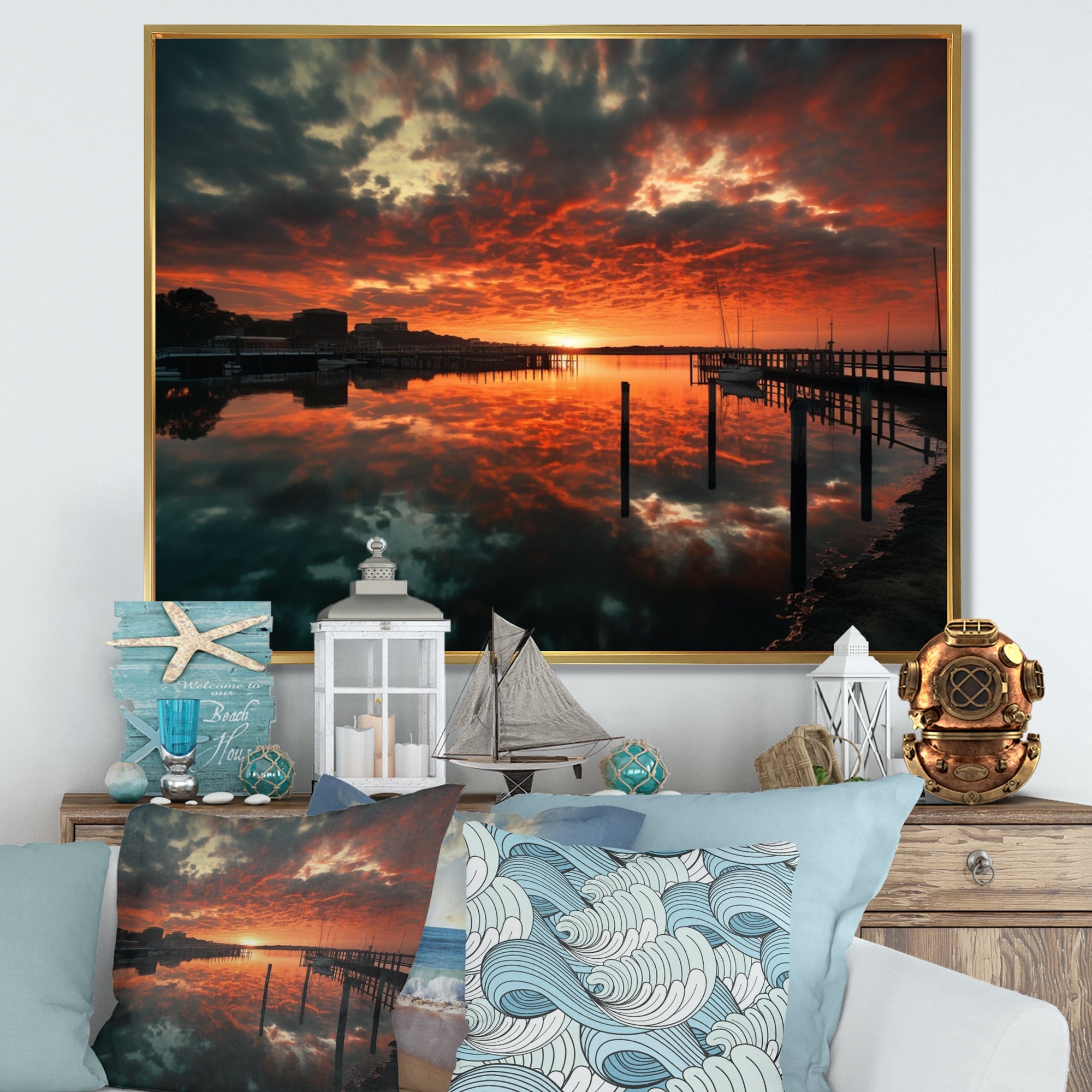 Designart "Sunset Over Port Iv" Modern Landscape Beach Framed Canvas Art Print