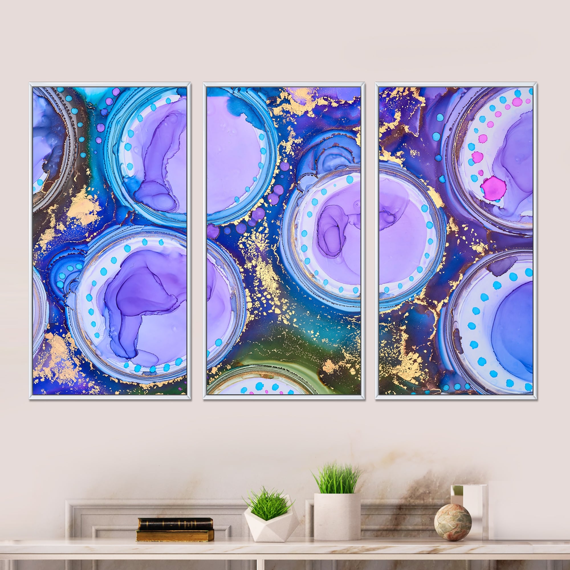 Designart "Purple And Blue Luxury Abstract Fluid Art IX" Modern Framed Art Prints Set of 3 - 4 Colors of Frames