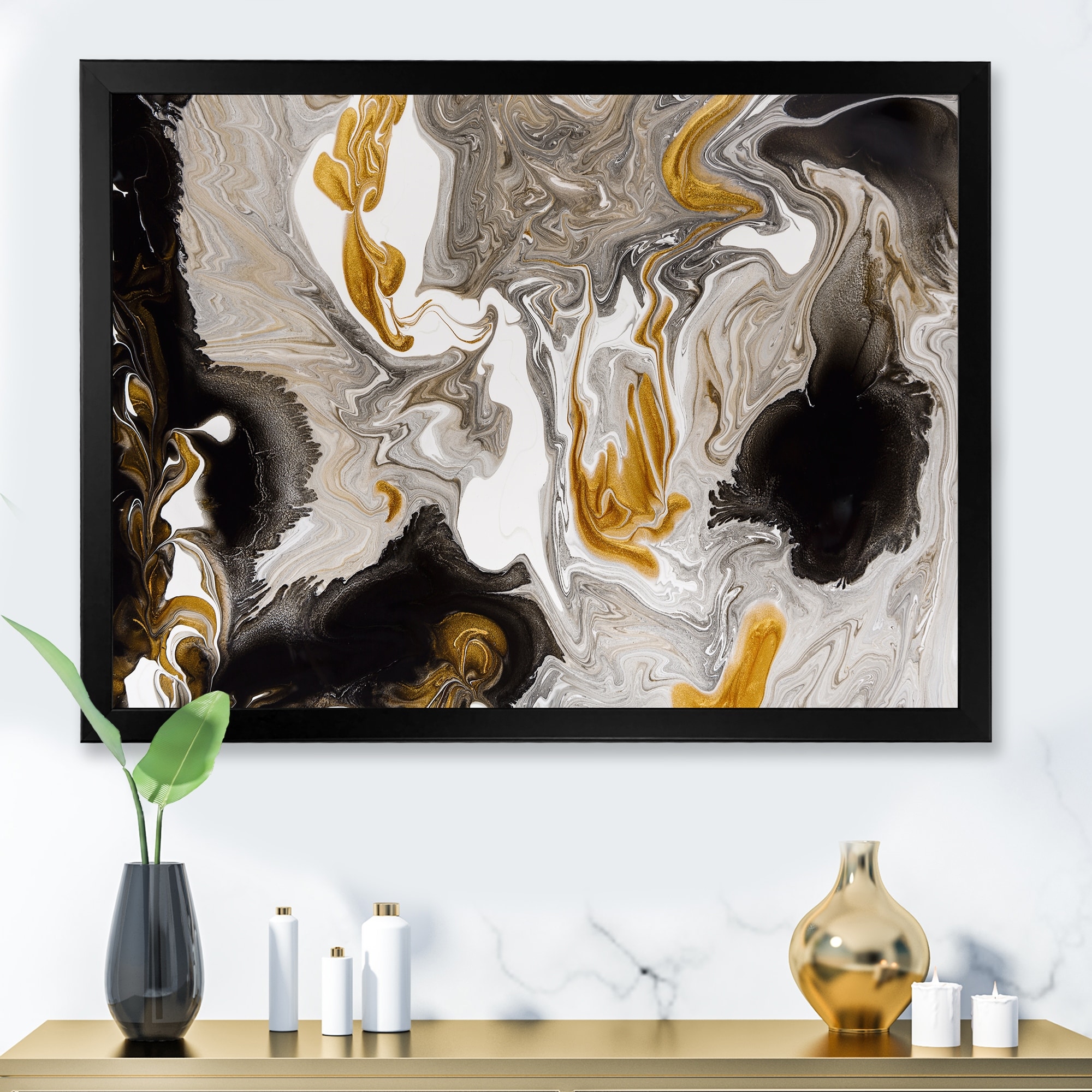 Designart "Gold And Black Marble Waves I" Modern Framed Art Print