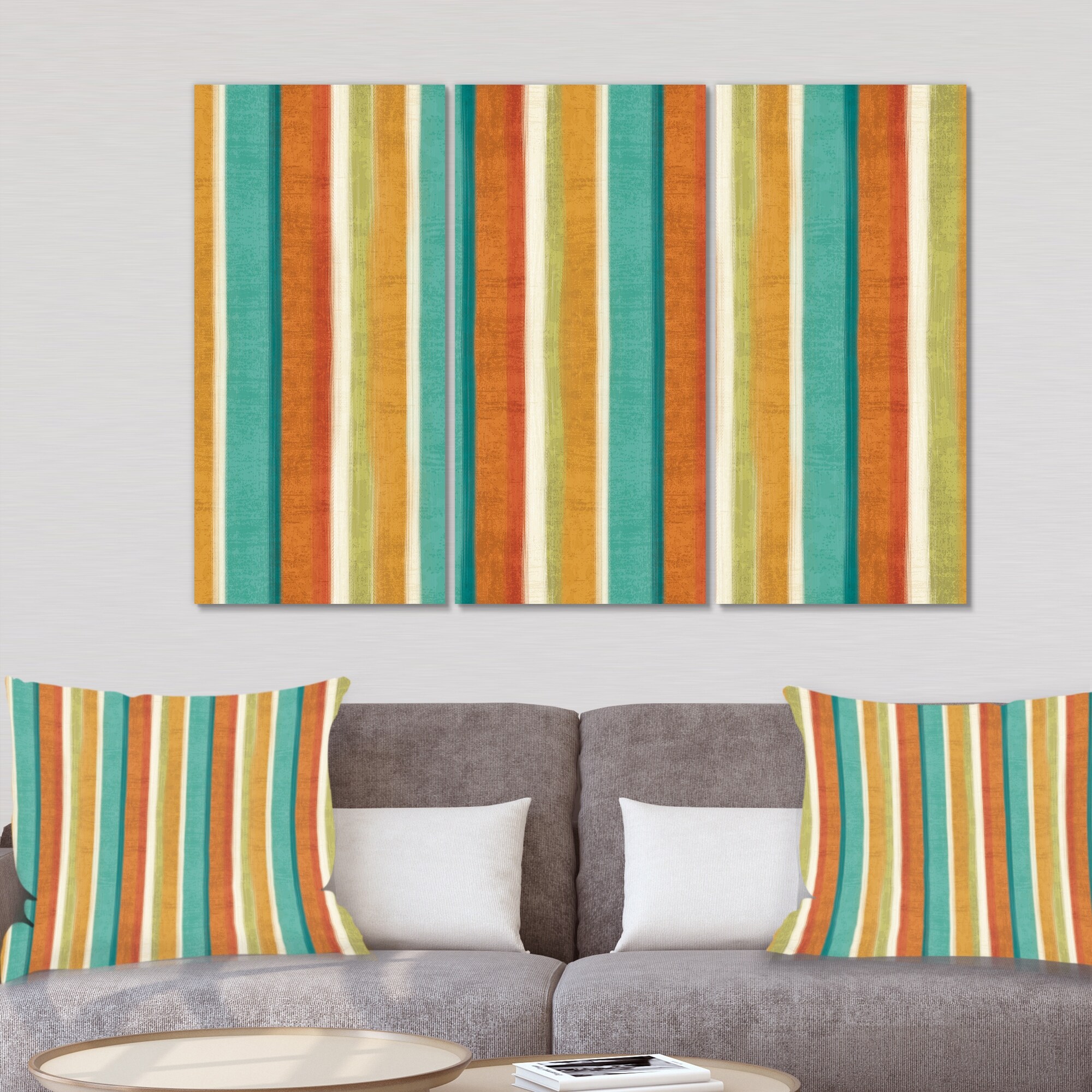 Designart "Blue, Green and Orange Vertical Abstract Stripes" Mid Century Modern Canvas Art