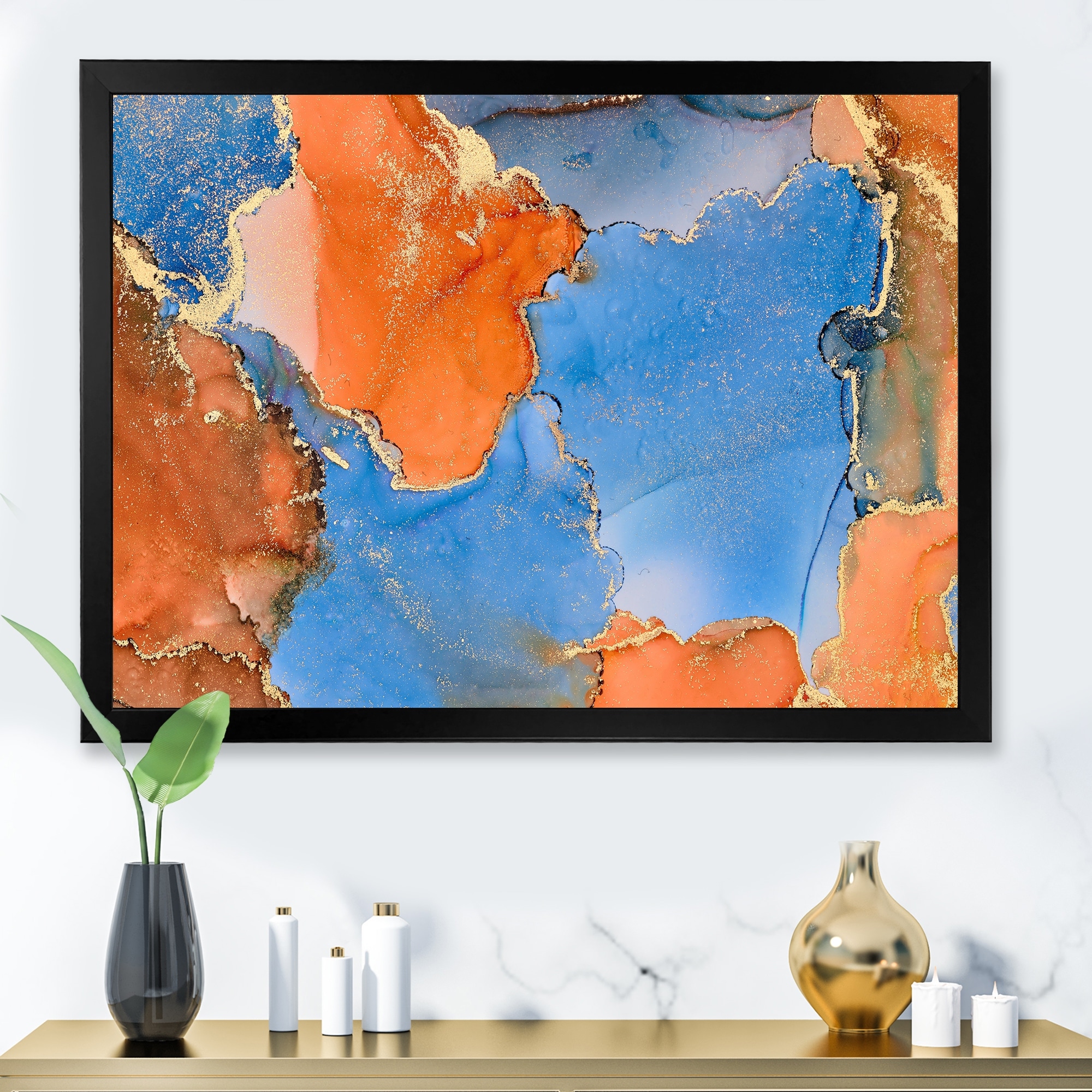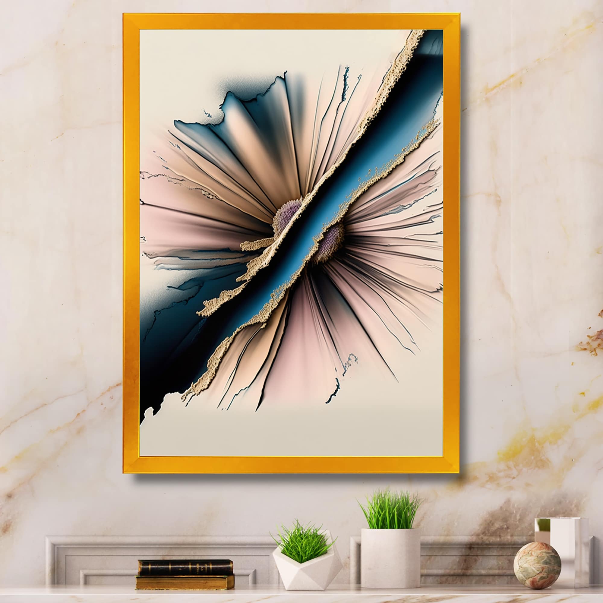 Designart "Blue And Gold Luxury Abstract Fluid Art II" Modern Framed Canvas Wall Art Print