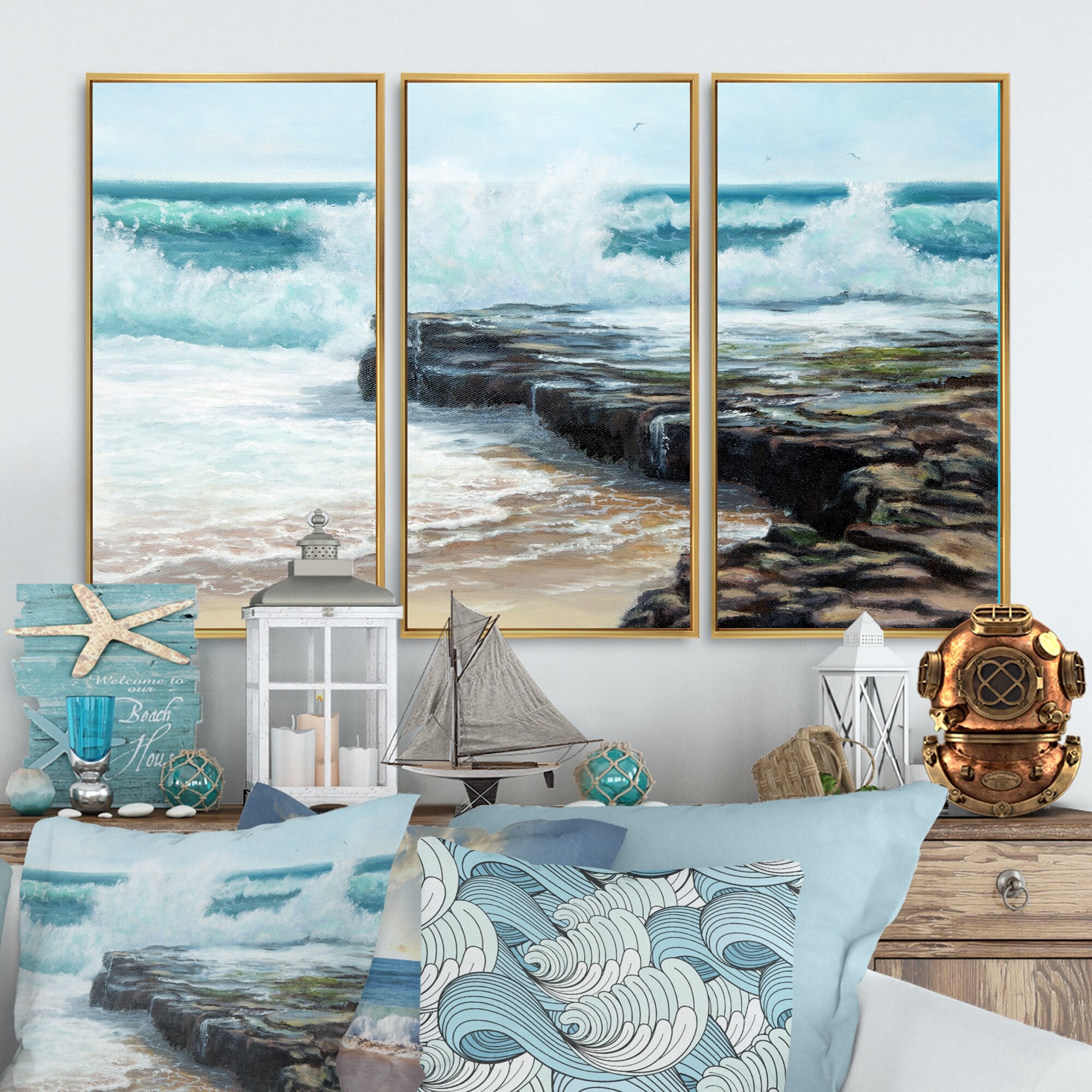 Designart "Wild Waves Breaking on the Shore" Nautical & Coastal Framed Art Prints Set of 3 - 4 Colors of Frames