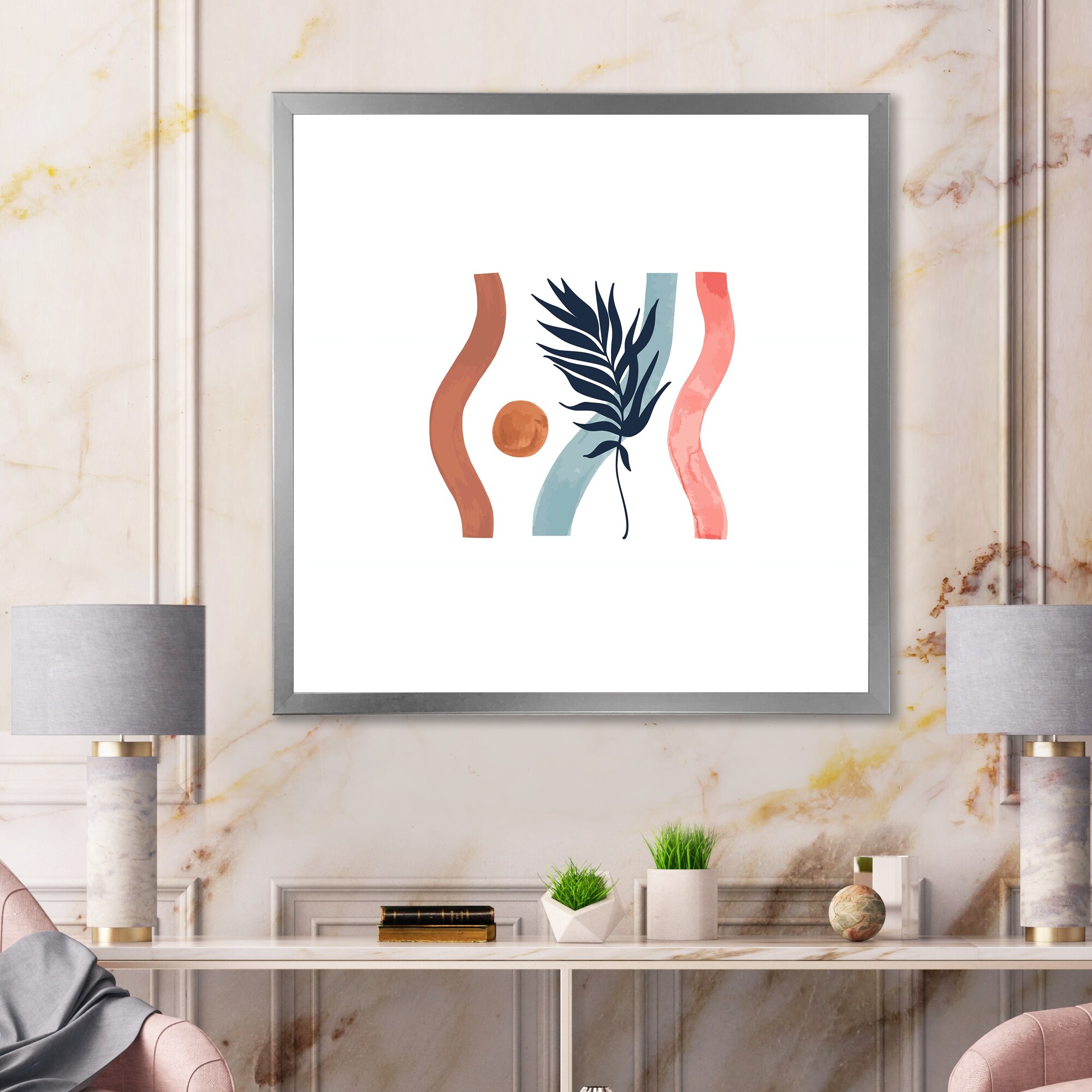 Designart "Tropical Leaf And Wavy Stripes" Tropical Framed Art Print