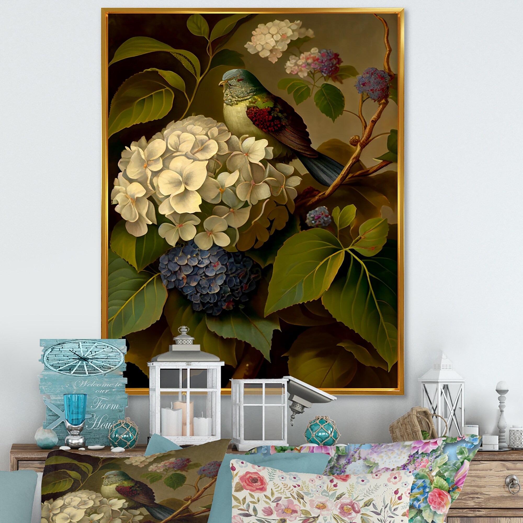 Designart "Blossoming Hydrangena in Retro Colors IV" Floral Framed Canvas Wall Art Print