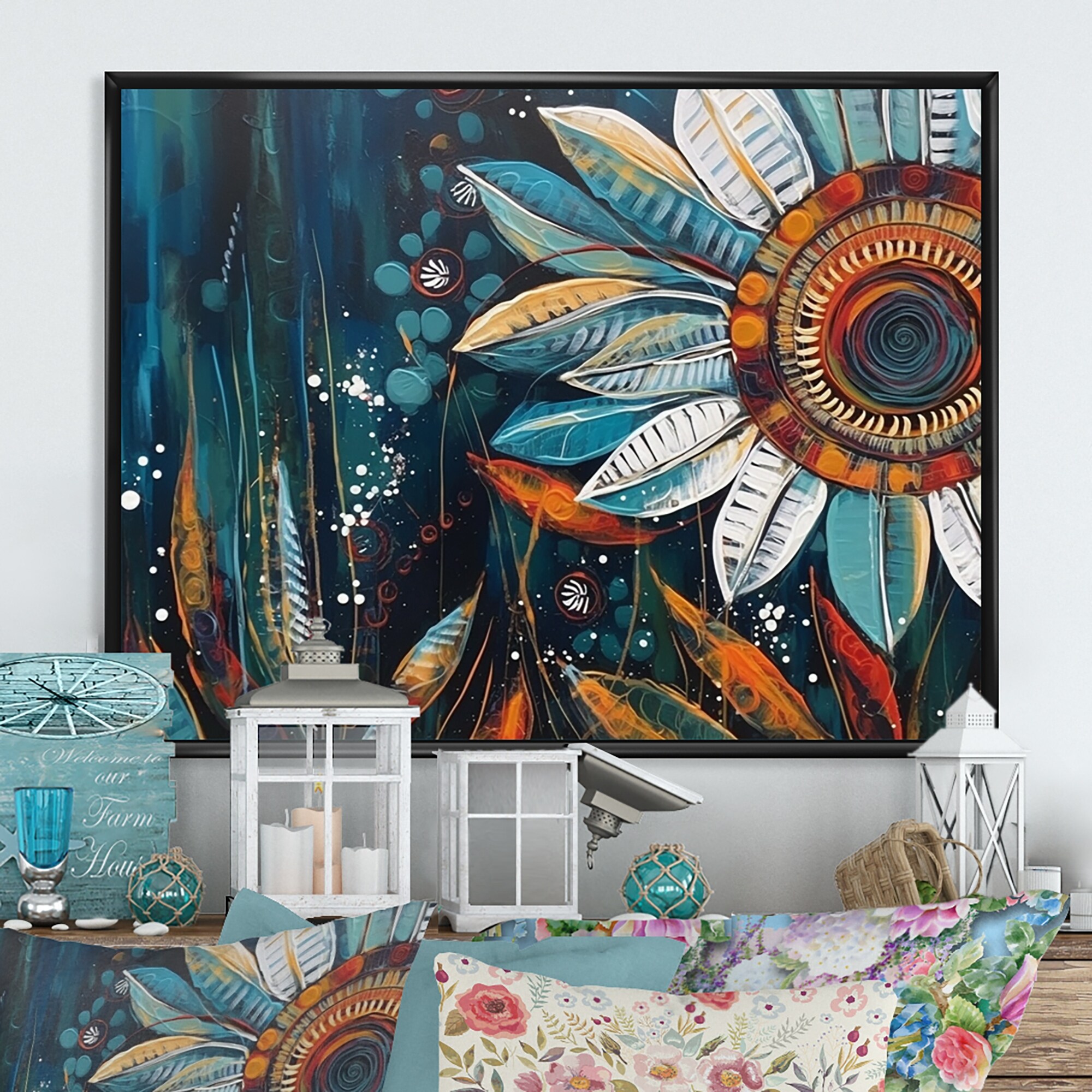 Designart "Orange And Blue Artistic Reflections of a Free Mind I" Boho Feather Framed Wall Art for Living Room