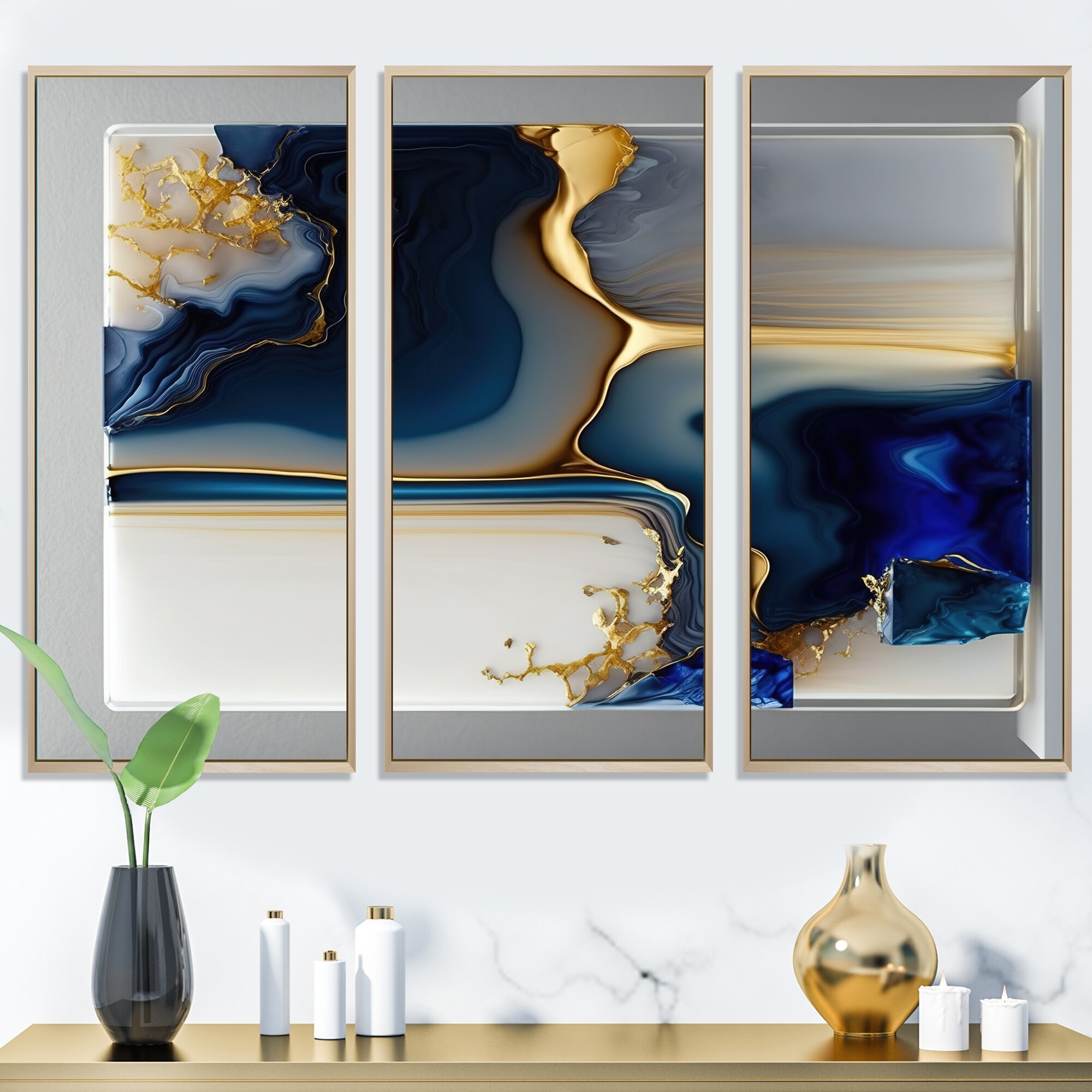 Designart "Abstract Geode Gold And Blue Marble Shape I" Modern Geometric Framed Canvas Art Print - 3 Panels
