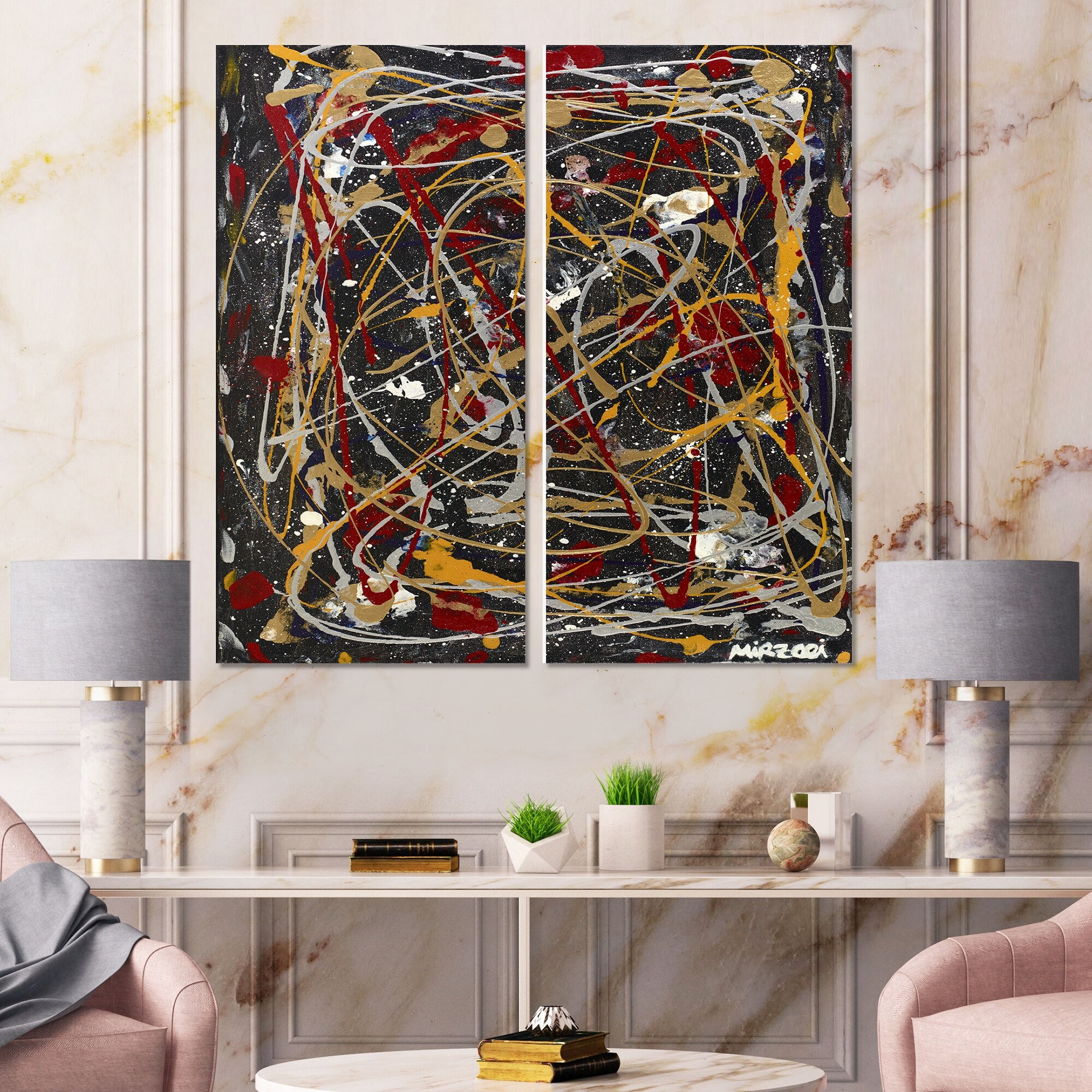 Designart "Red, Yellow and Black Pollock Style I" Modern & Contemporary Canvas Wall Art Print 2 Piece Set