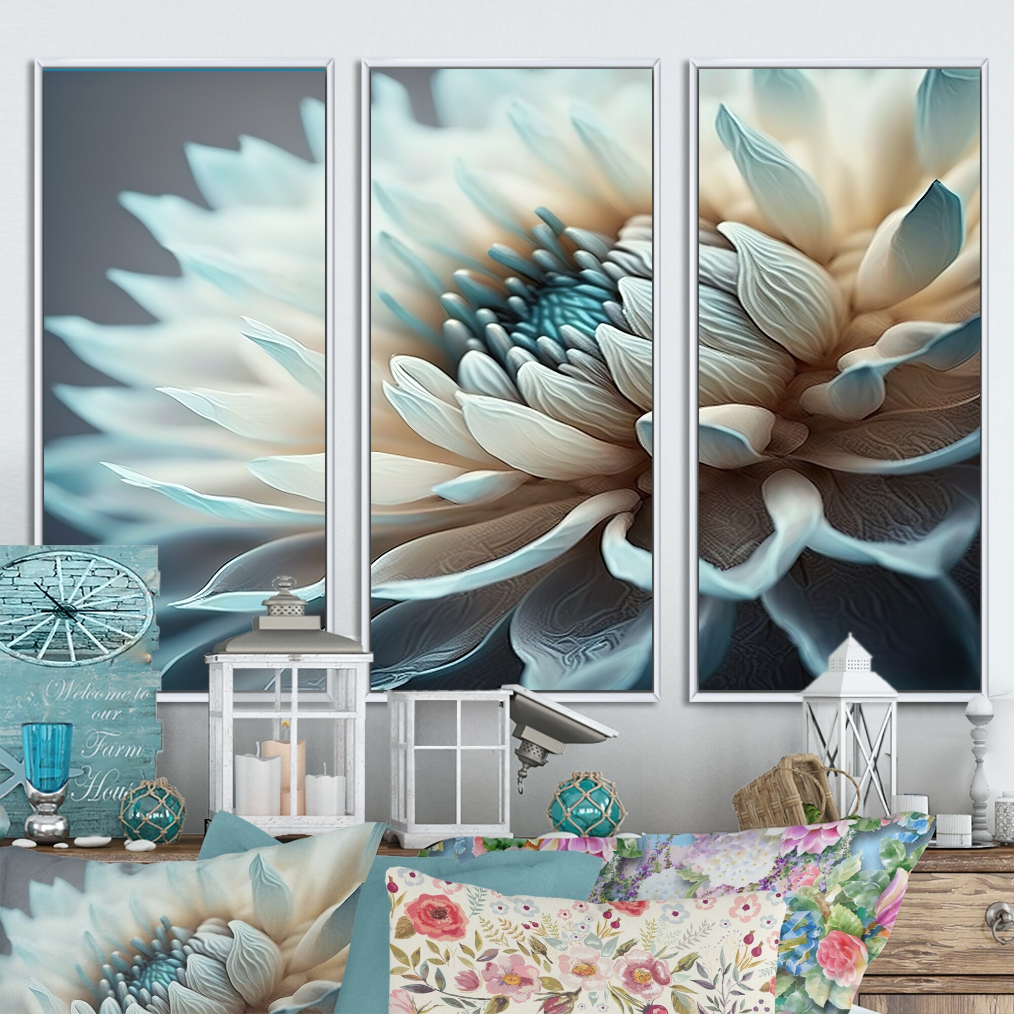 Designart "Dahlia Flowers Blue And White III" Floral Dahlia Framed Canvas Art Print - 3 Panels