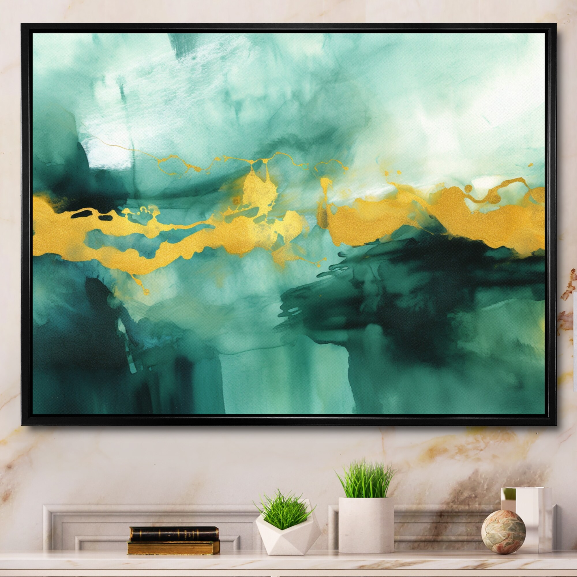 Designart "Exploring The Depths of Gold Marble Iv" Modern Geometric Framed Wall Art for Living Room