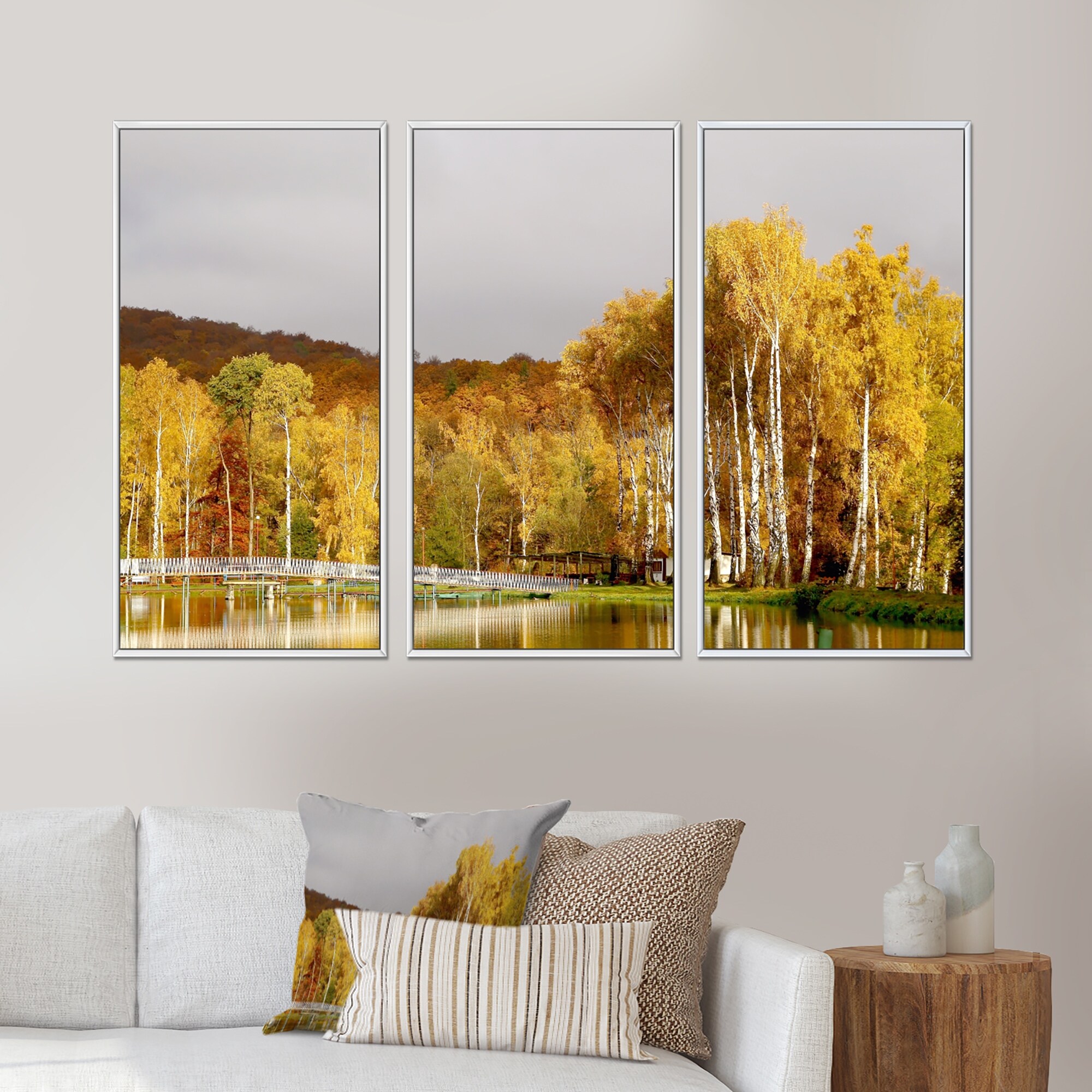 Designart "Autumn Birches By the Lake" Farmhouse Framed Wall Art Set of 3 - 4 Colors of Frames