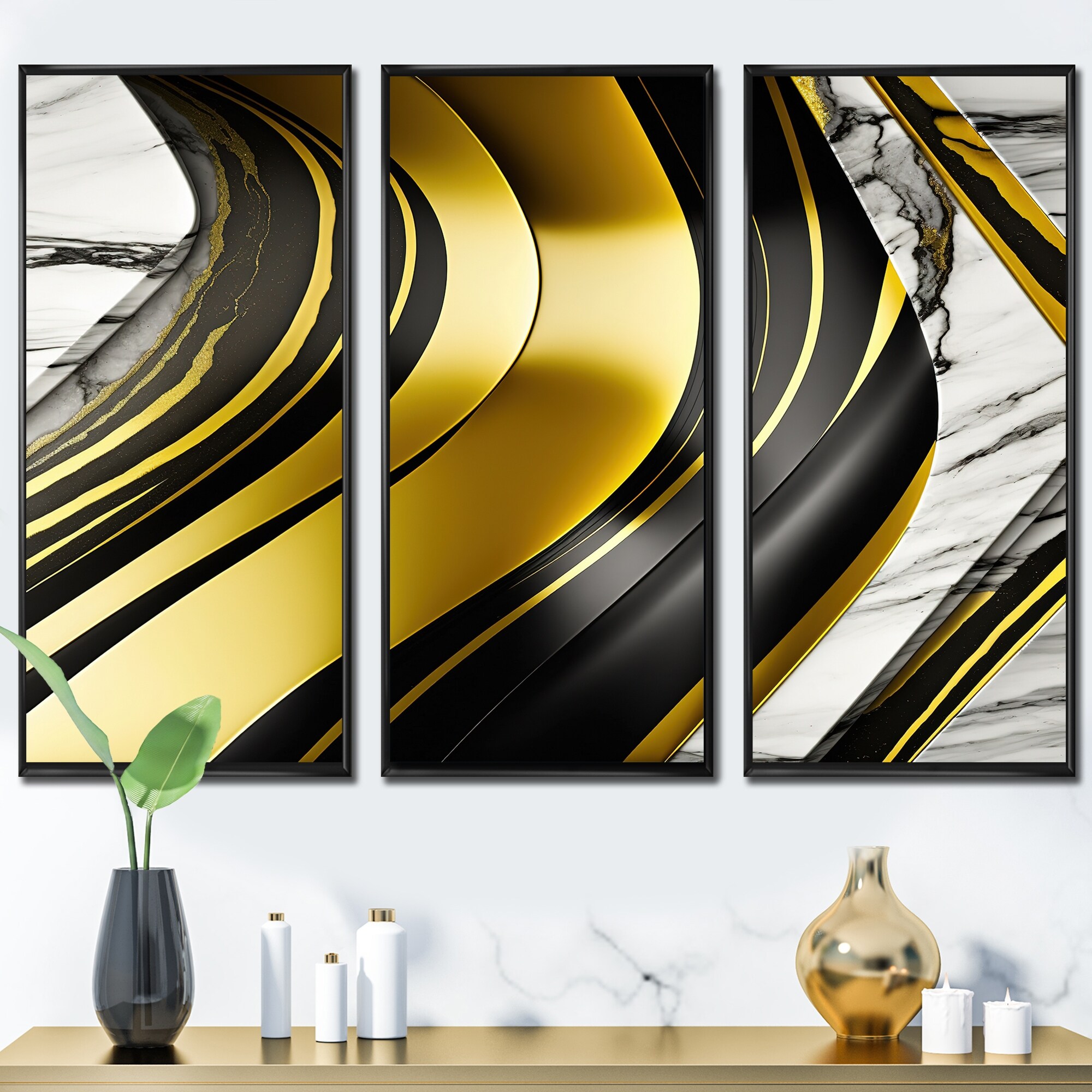 Designart "Abstract Geode Marble Waves Gold I" Modern Waves Framed Canvas Art Print - 3 Panels