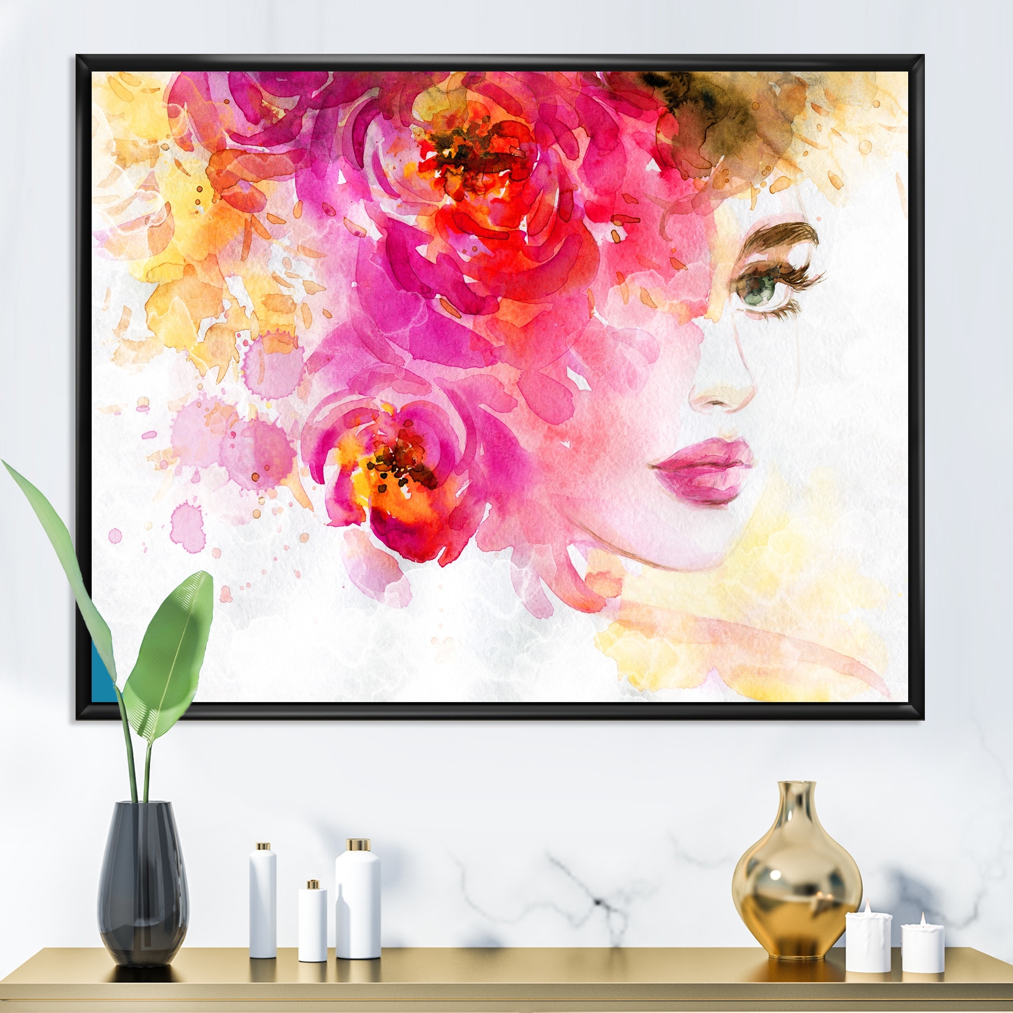 Designart "Floral Pink Woman Portrait" Glam Framed Canvas Wall Art