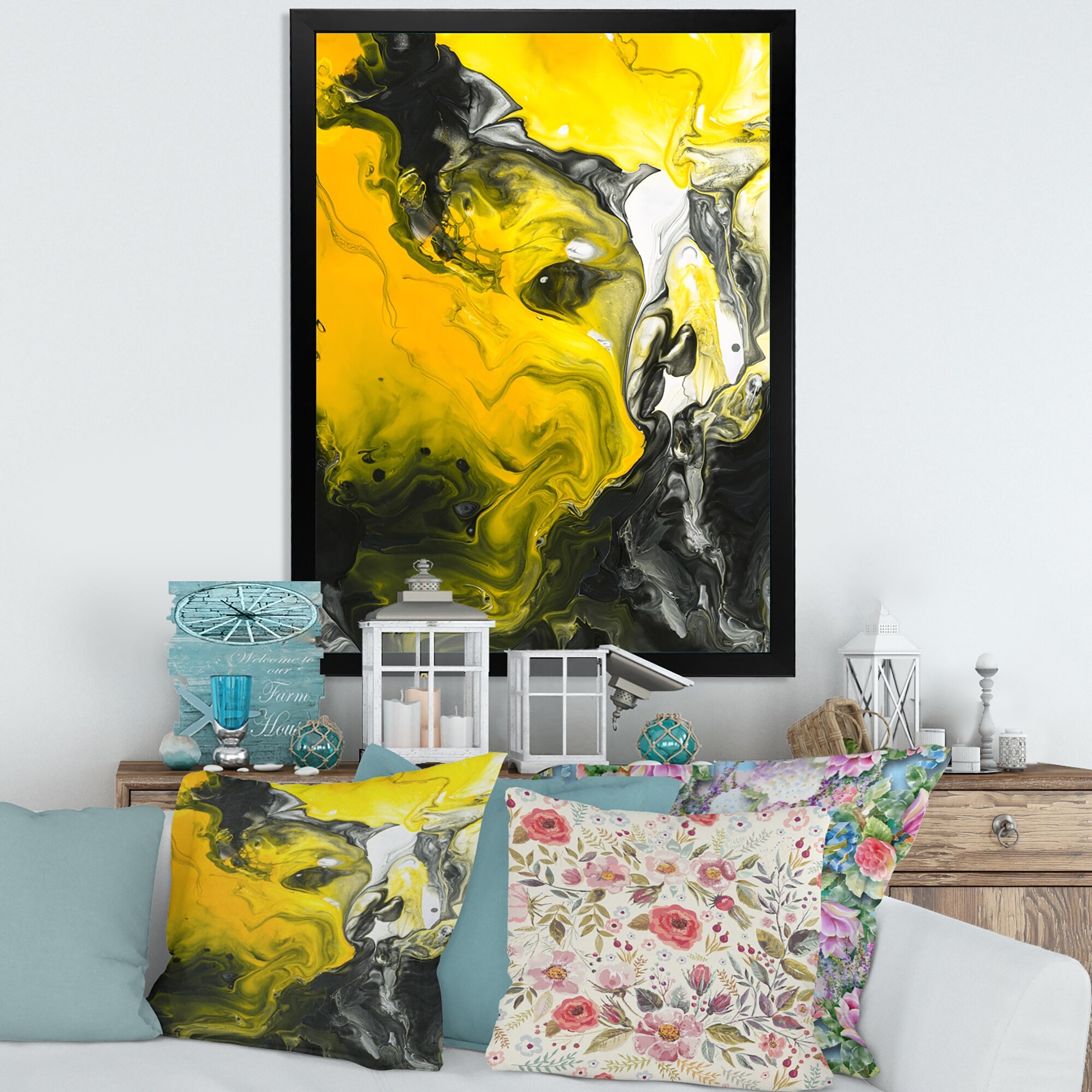 Designart "Yellow Black And White Liquid Art III" Modern Framed Art Print