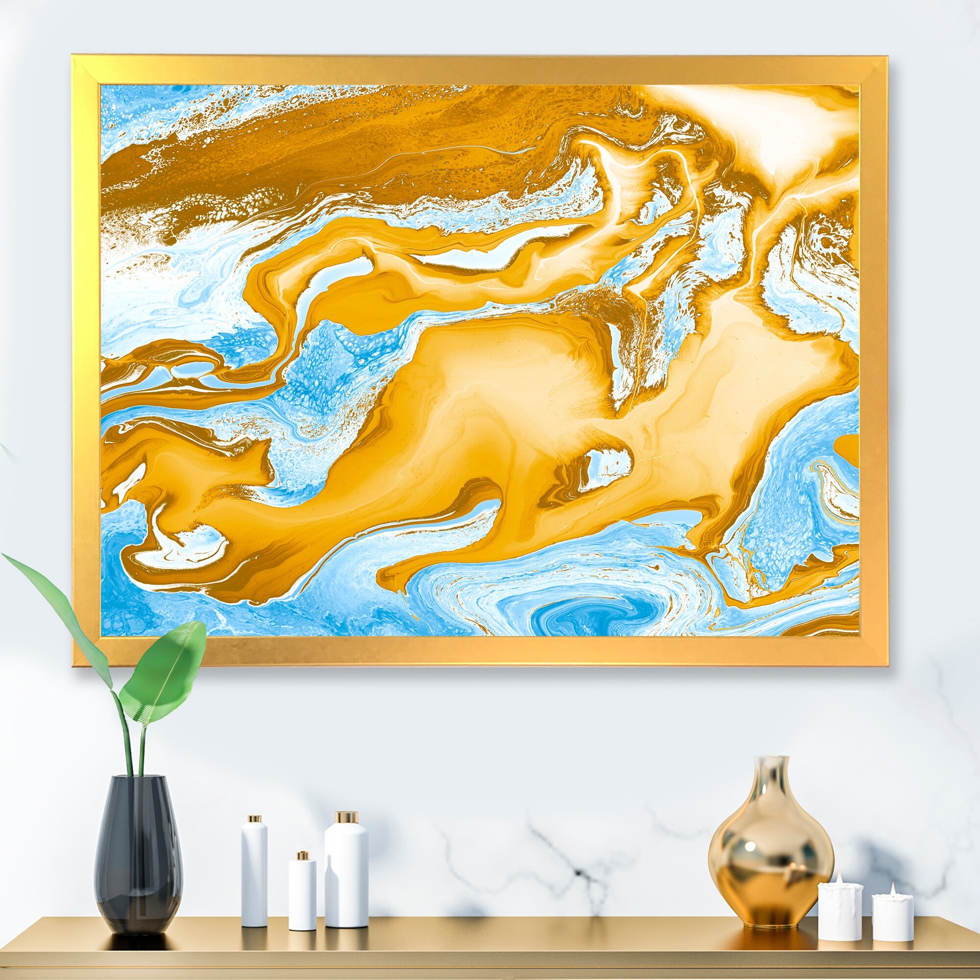 Designart "Blue And Gold Marble Waves" Modern Framed Art Print