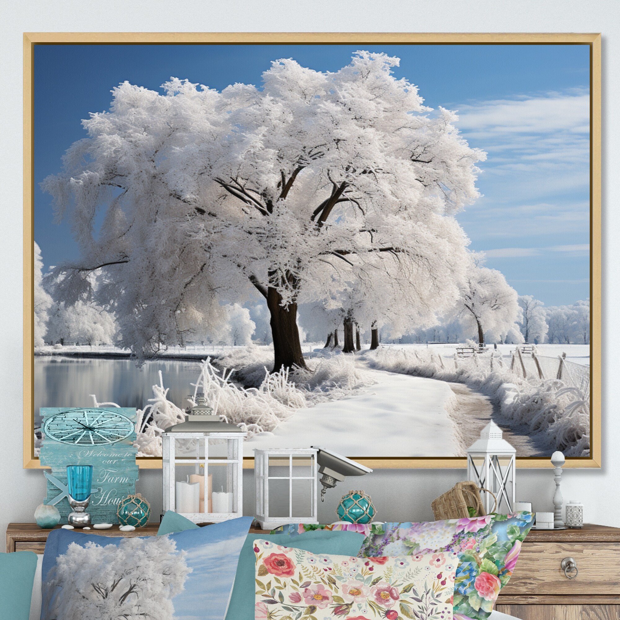 Designart "White Tree in Winter Scenery V" Winter Landscape Framed Wall Art Living Room