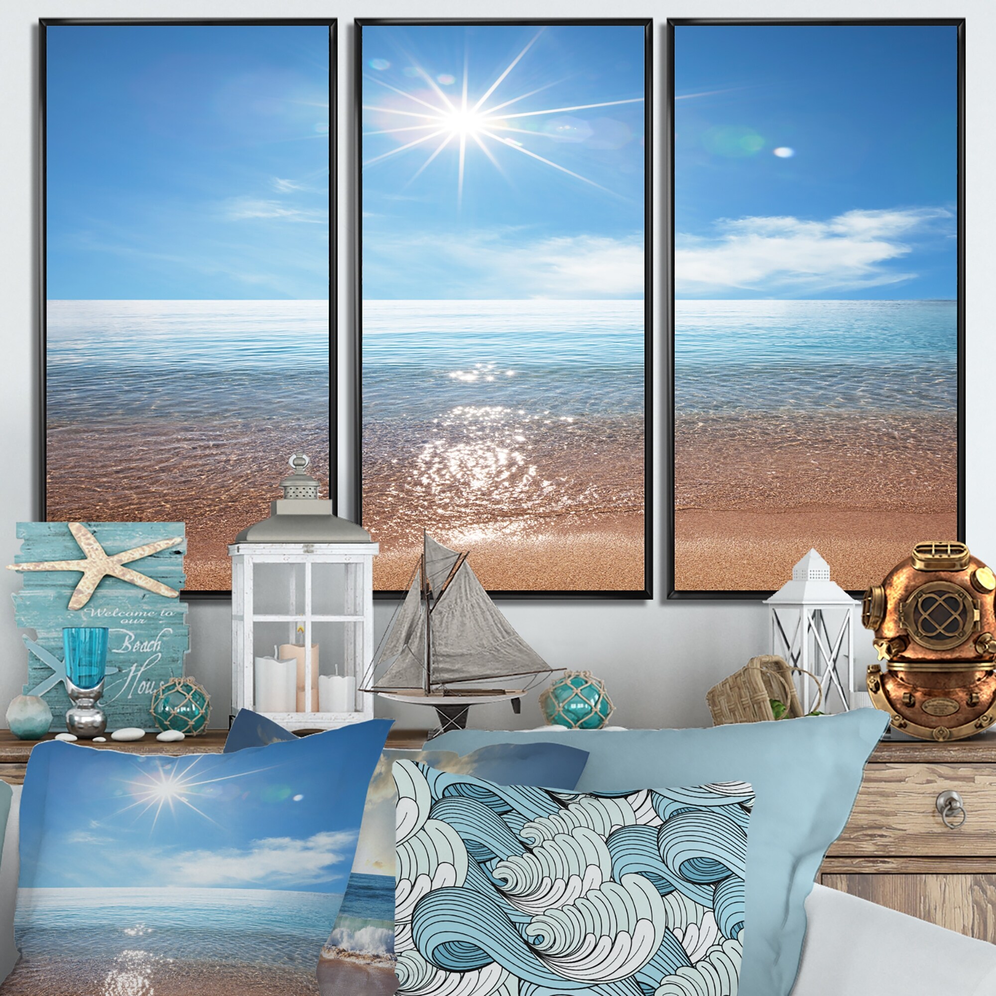 Designart "Serene Seascape with Bright Sun" Sea & Shore Framed Artwork Set of 3 - 4 Colors of Frames