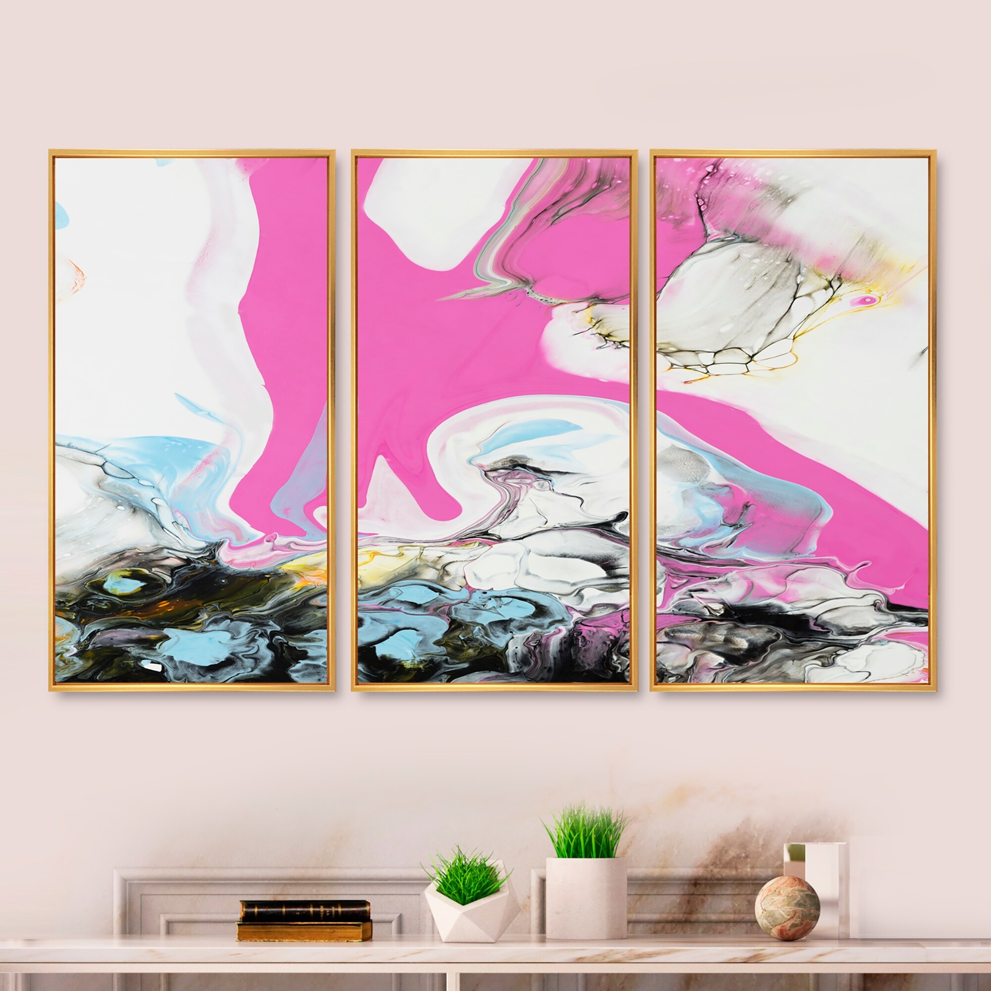 Designart "Pink Blue And Yellow Liquid Art III" Modern Framed Artwork Set of 3 - 4 Colors of Frames