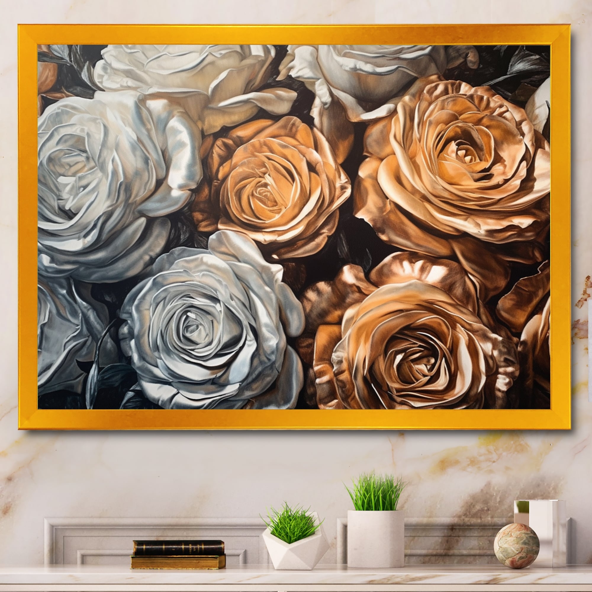 Designart "Gold Roses in Bloom" Floral Rose Framed Canvas Print