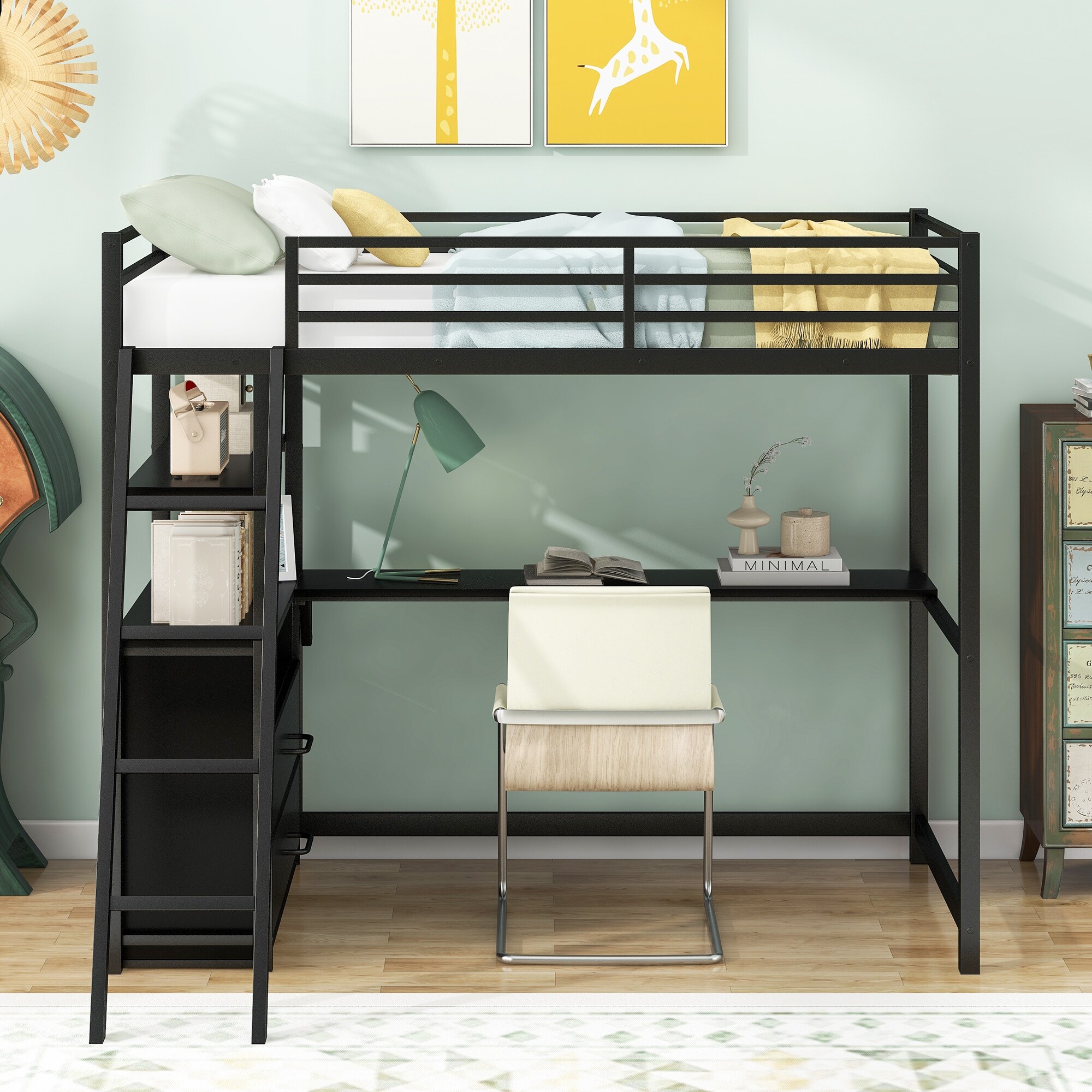 Twin Size Metal&Wood Loft Bed with Desk and Shelves, Two Built-in Drawers, Black