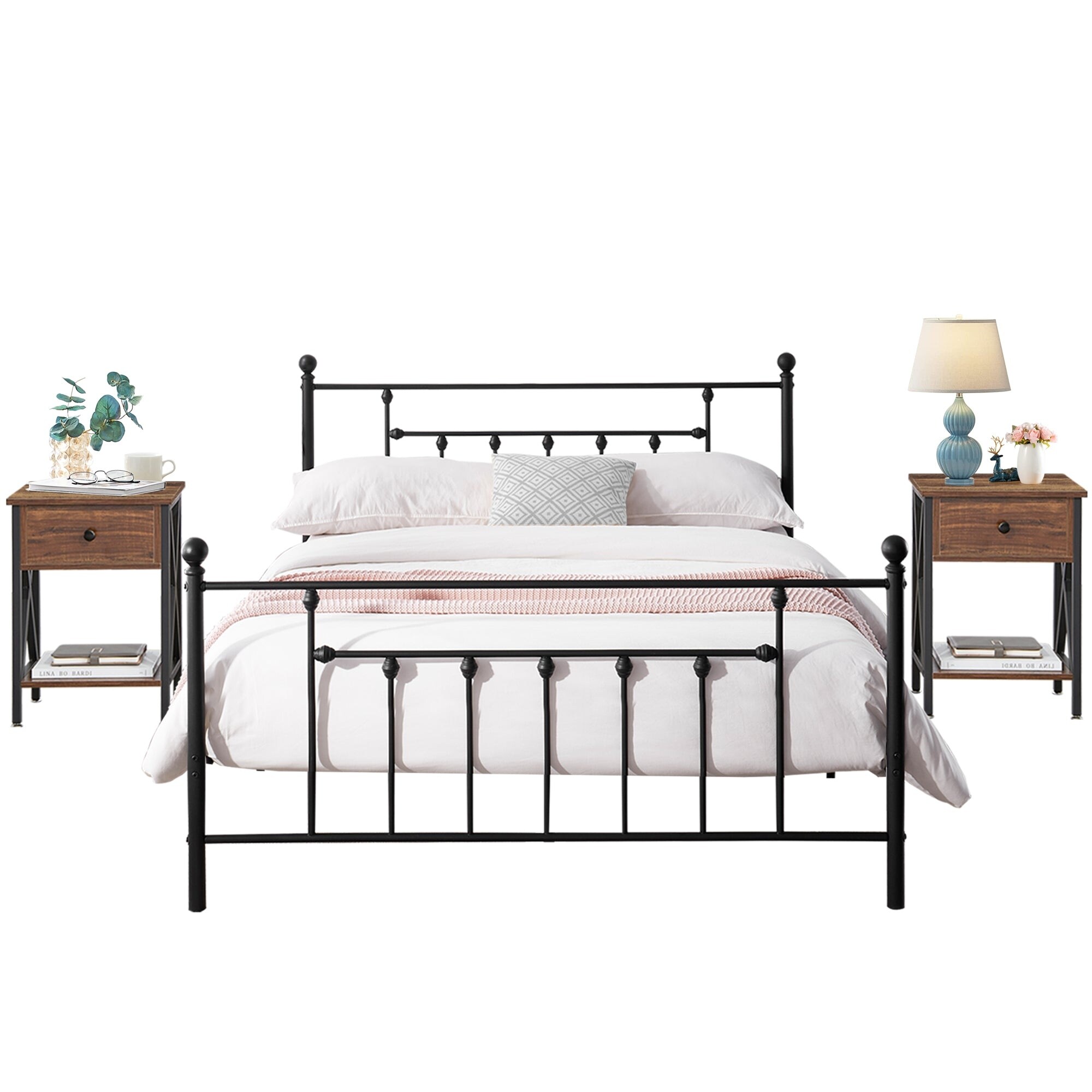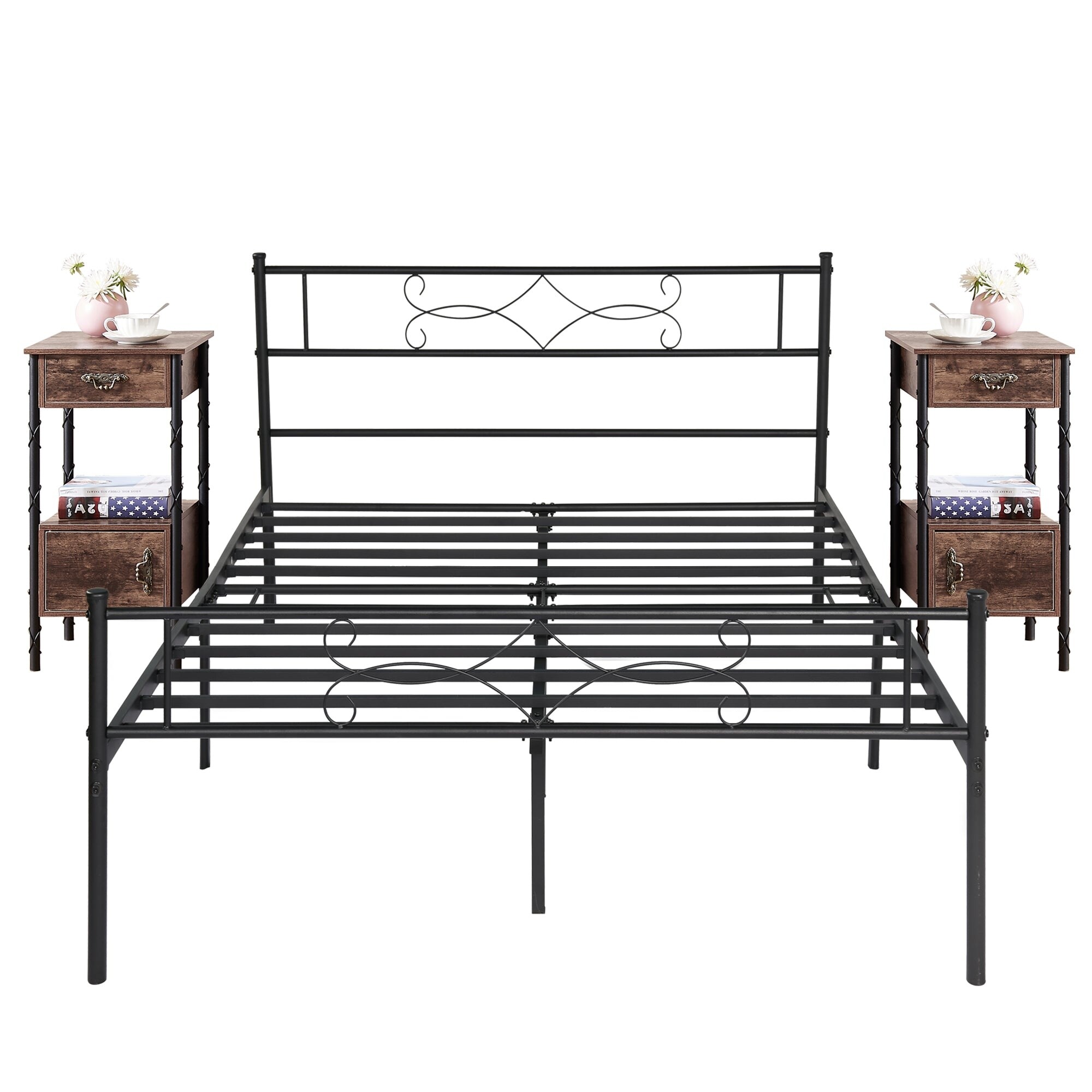 VECELO Industrial 3 Piece Bedroom Set Platform Bed Frame and Nightstands Set of 2