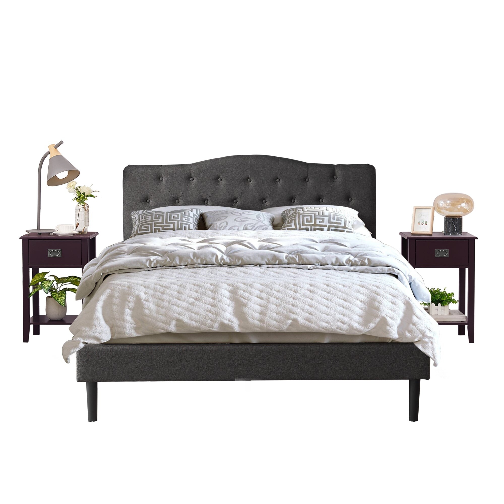 3-Pieces Bedroom Set with Dark Grey Height Adjustable Upholstered Bed and Nightstands Set of 2