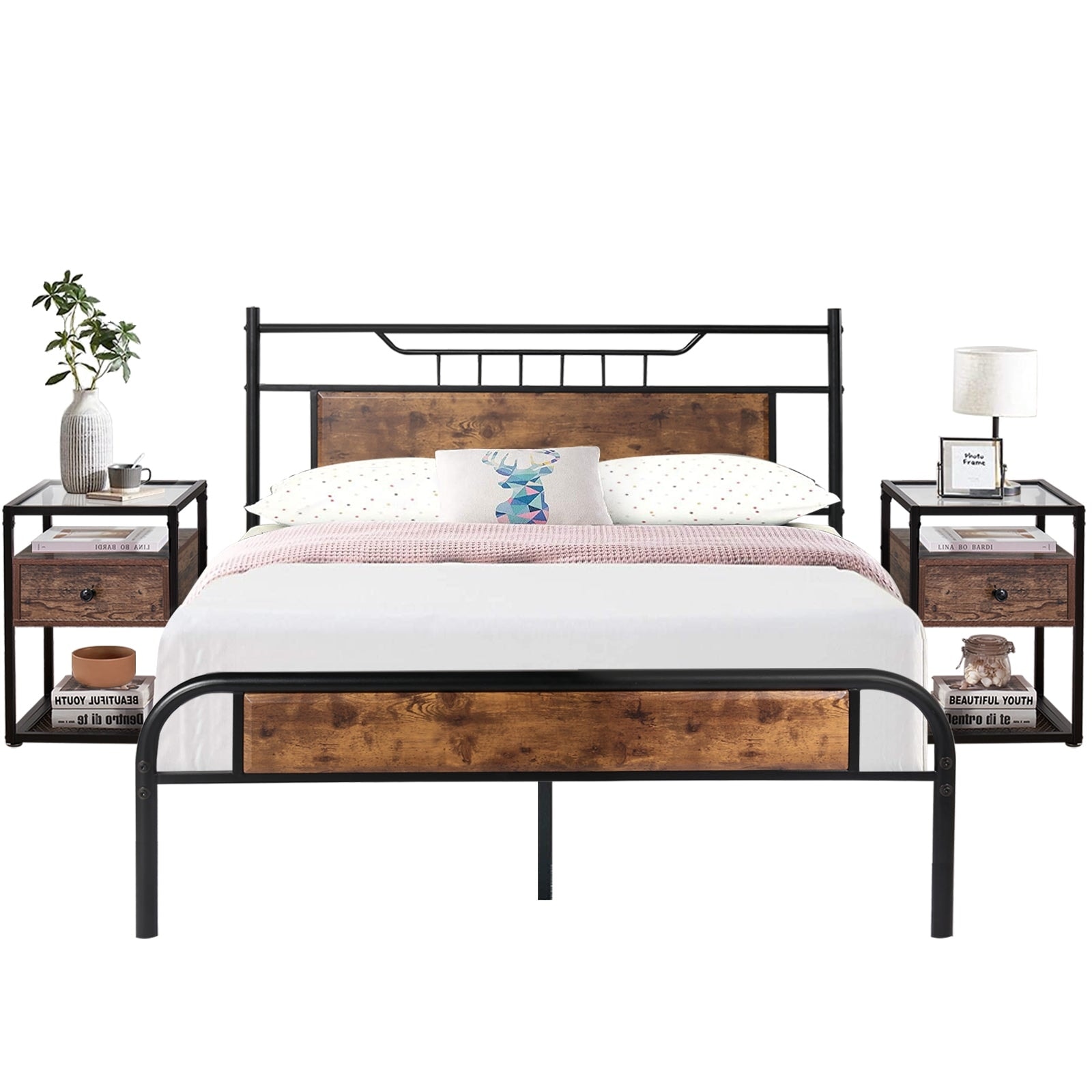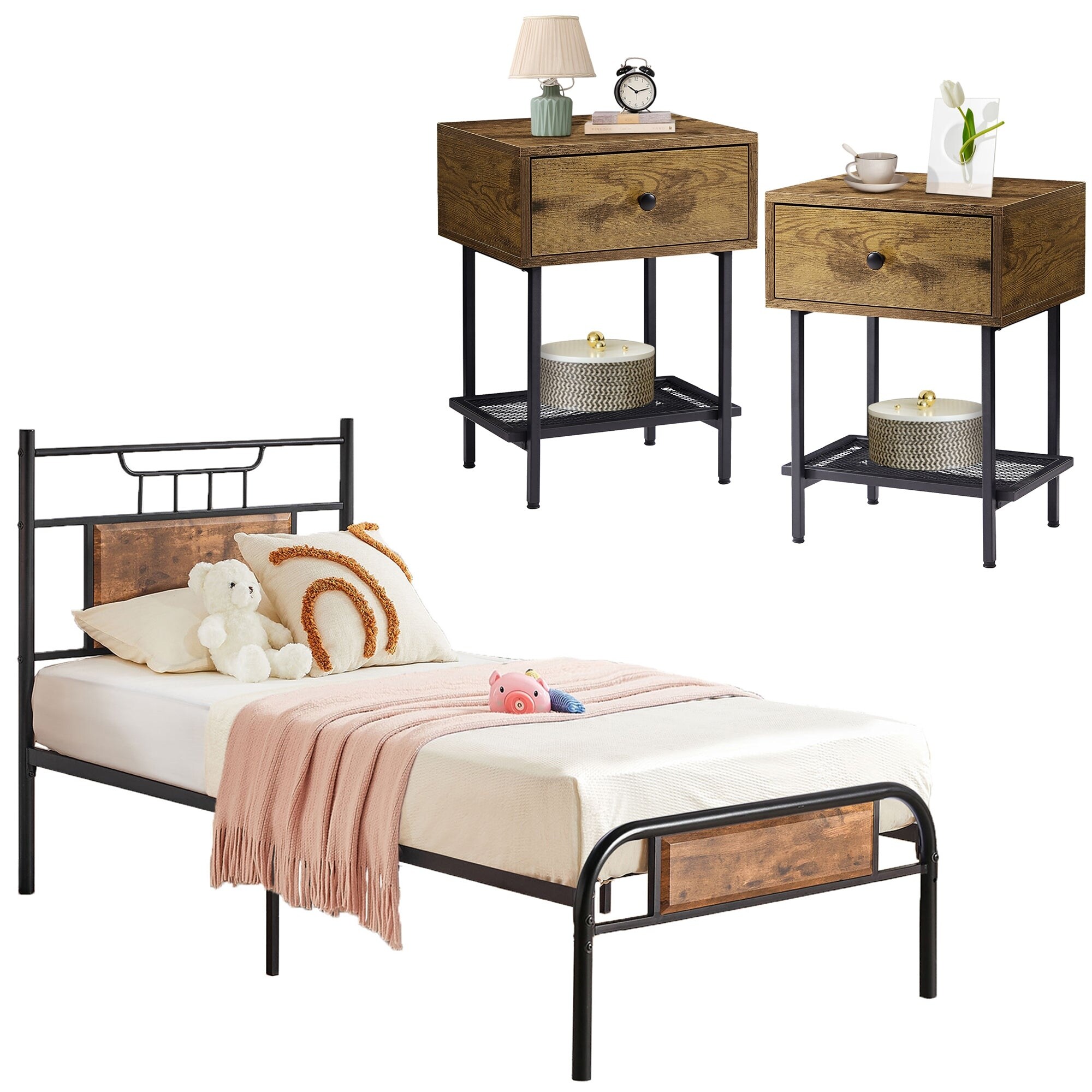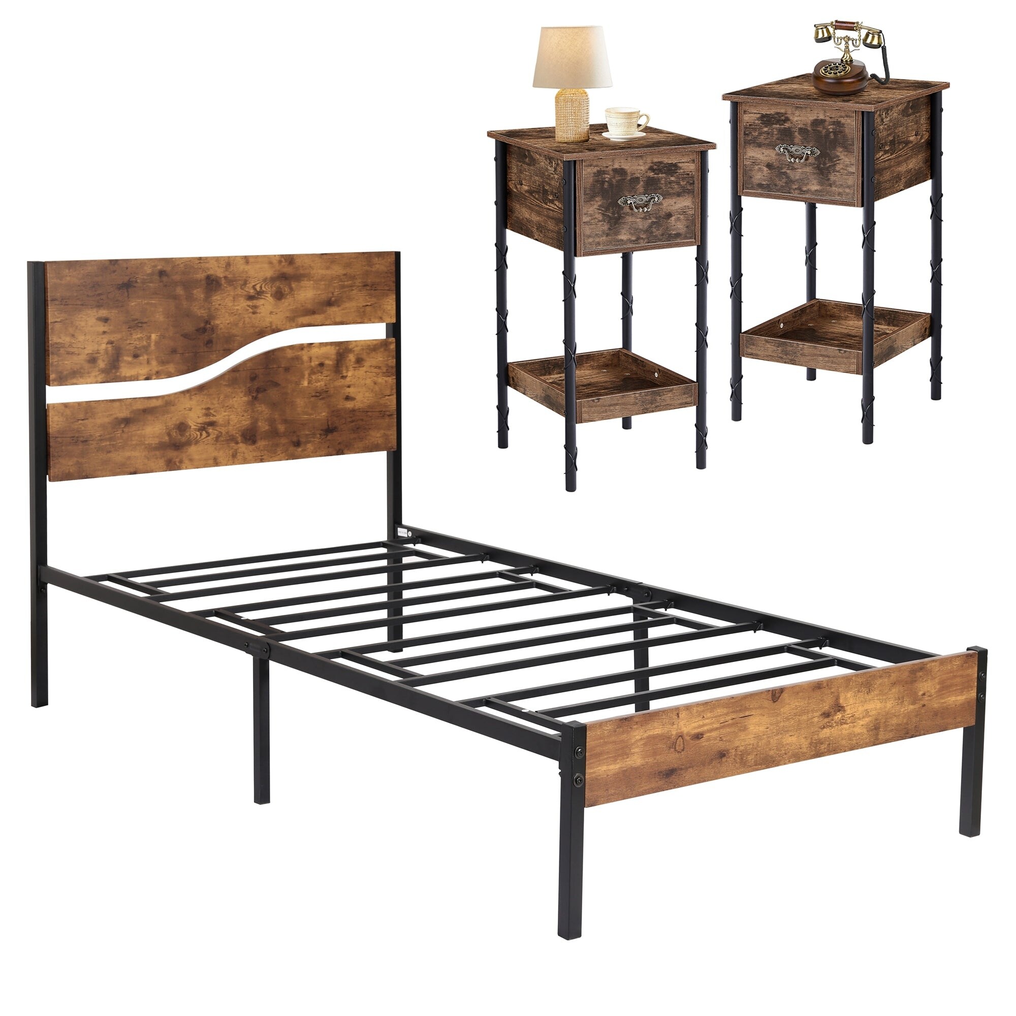 Industrial 3 Piece Bedroom Set Platform Bed and Brown Nightstands Set of 2