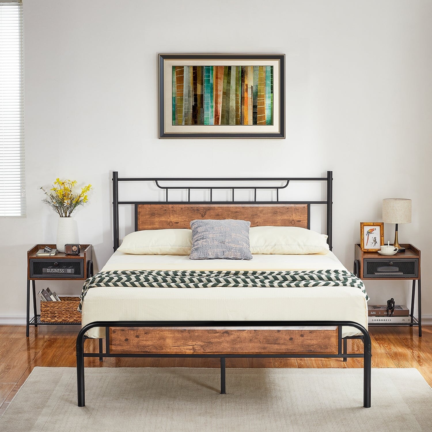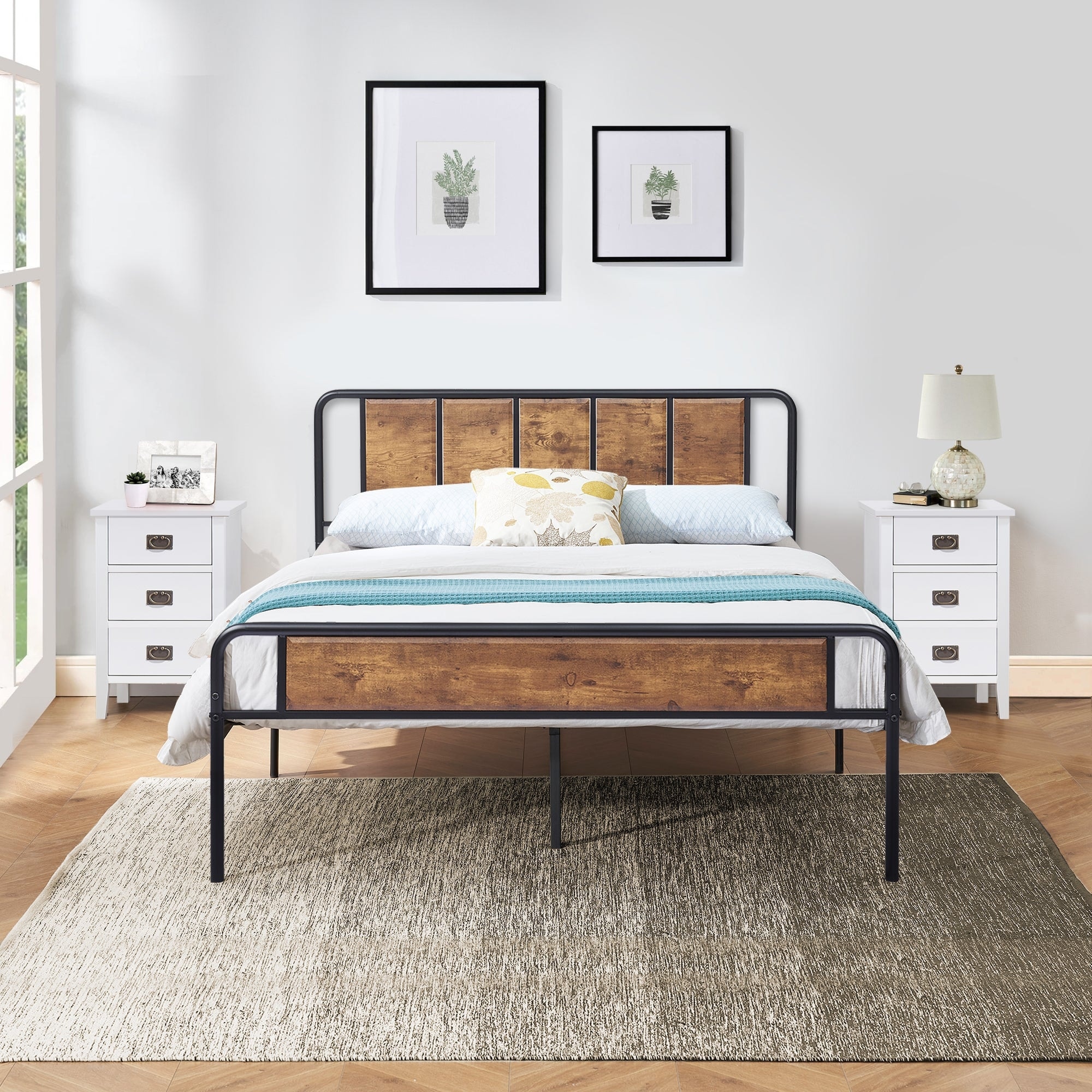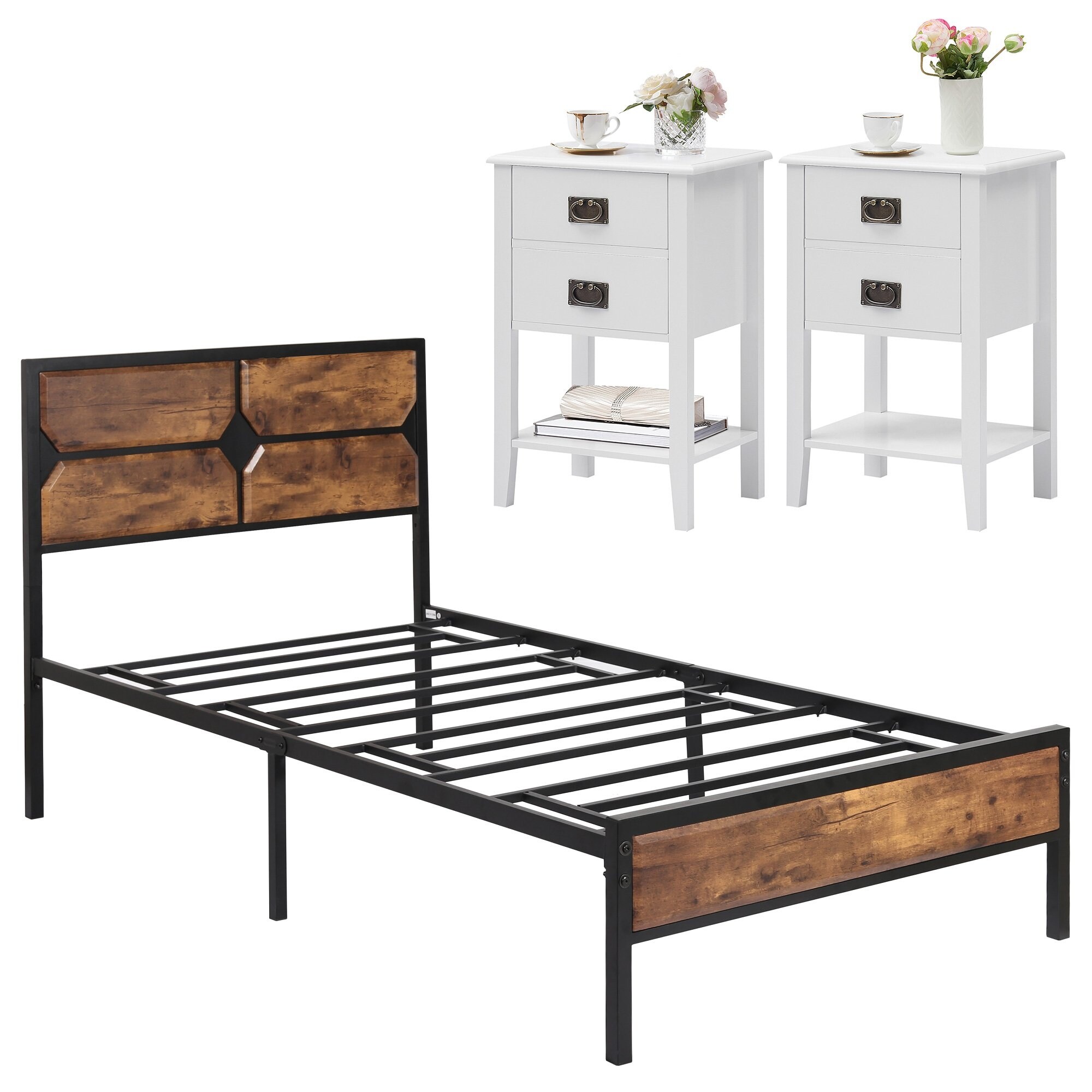 Industrial 3 Piece Bedroom Set Platform Bed and Brown Nightstands Set of 2