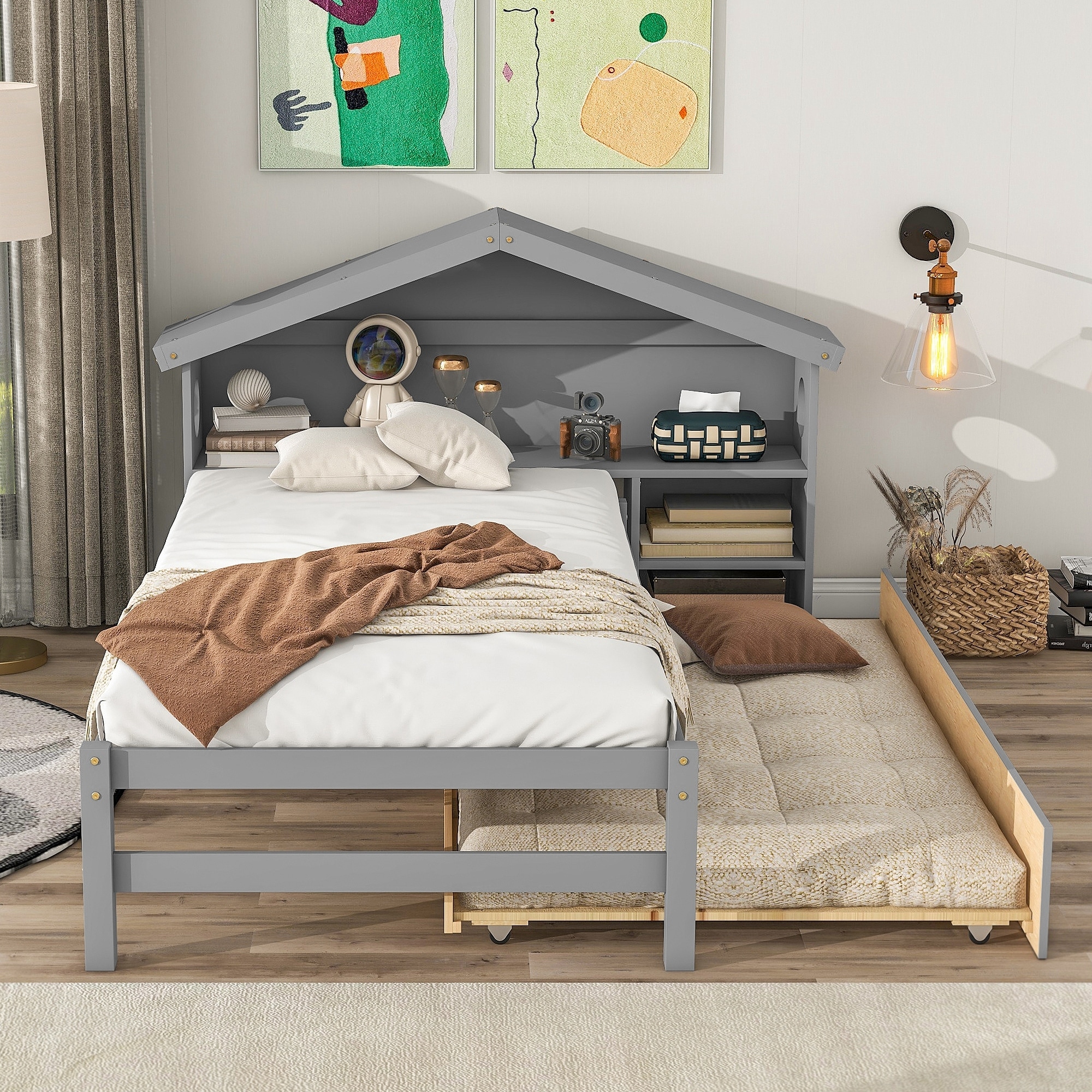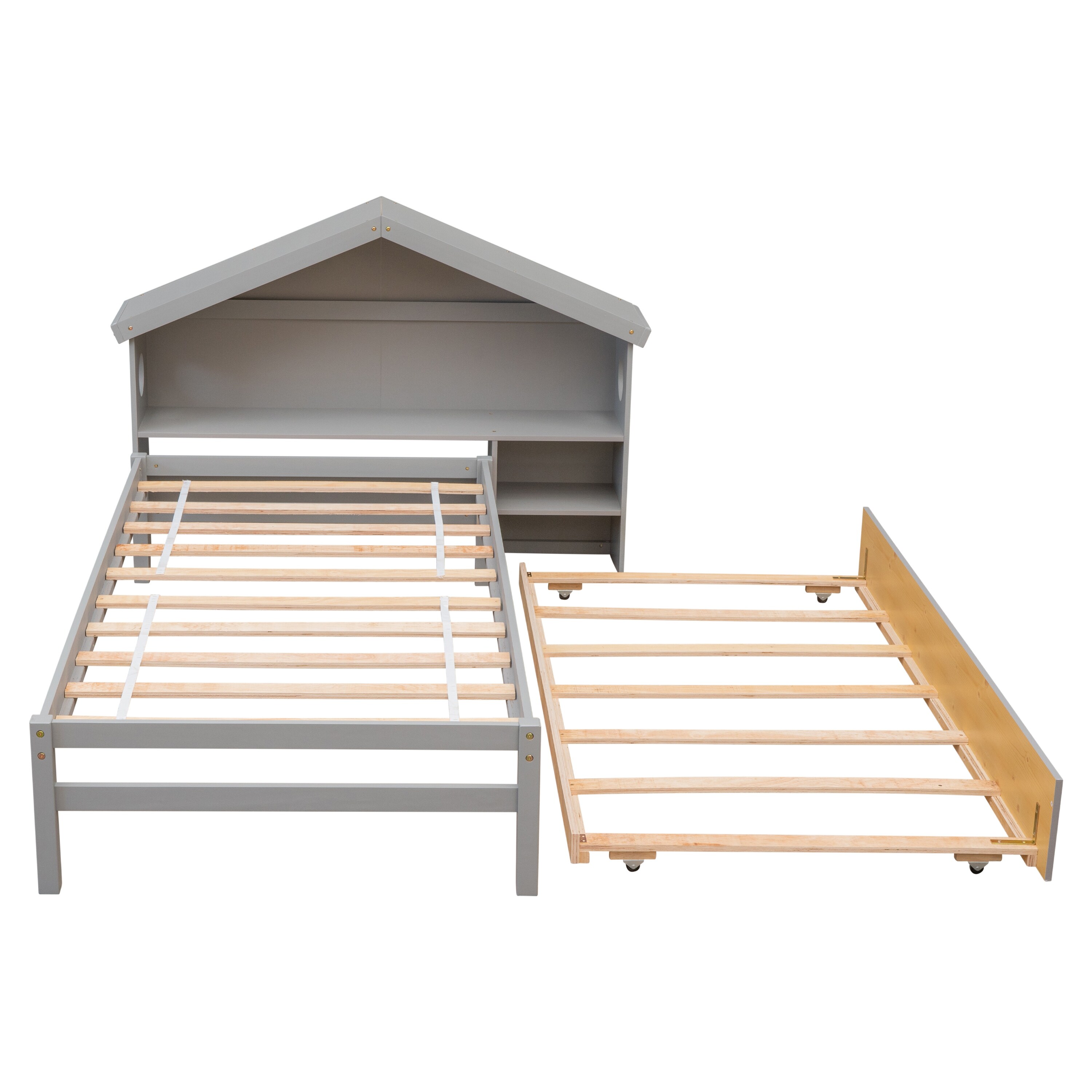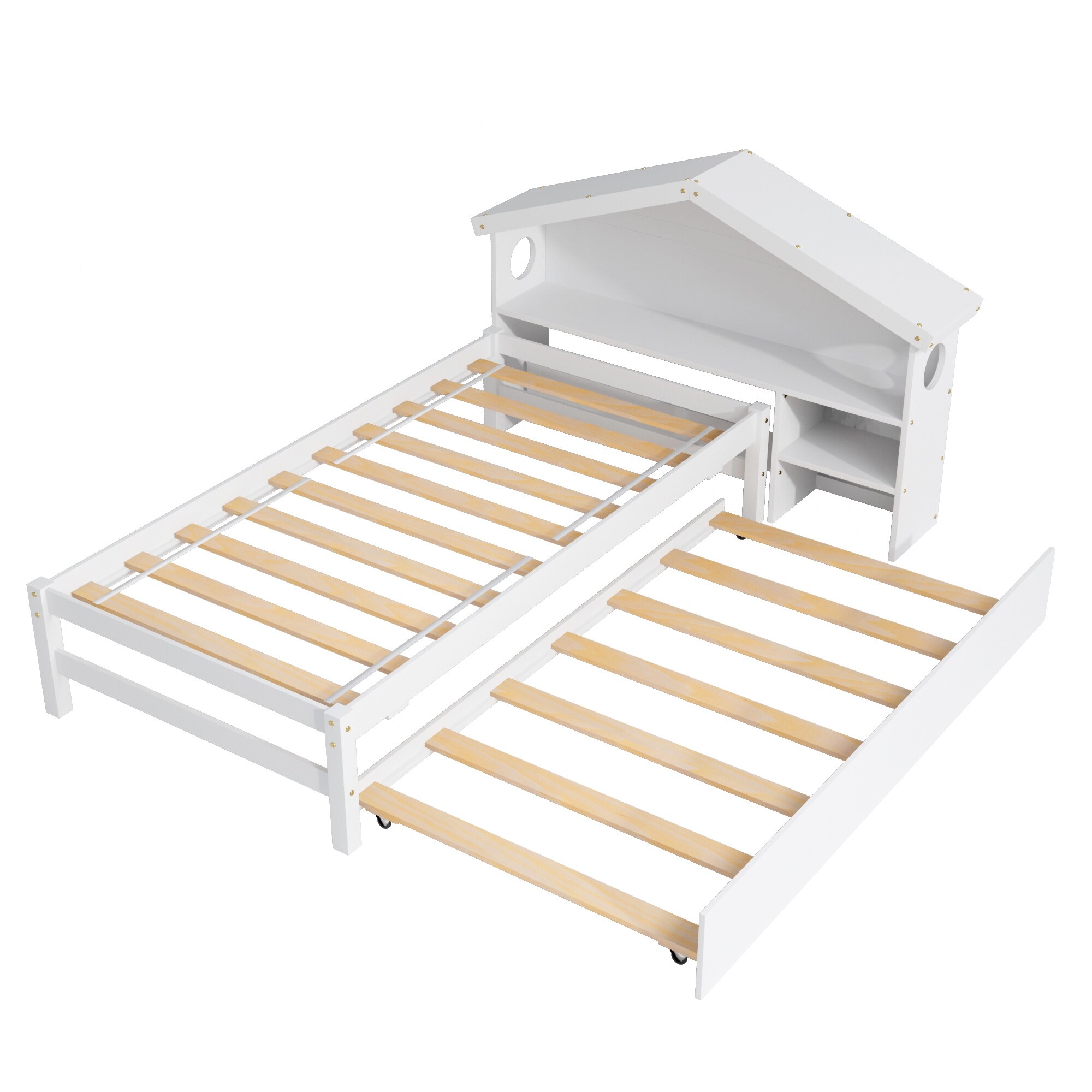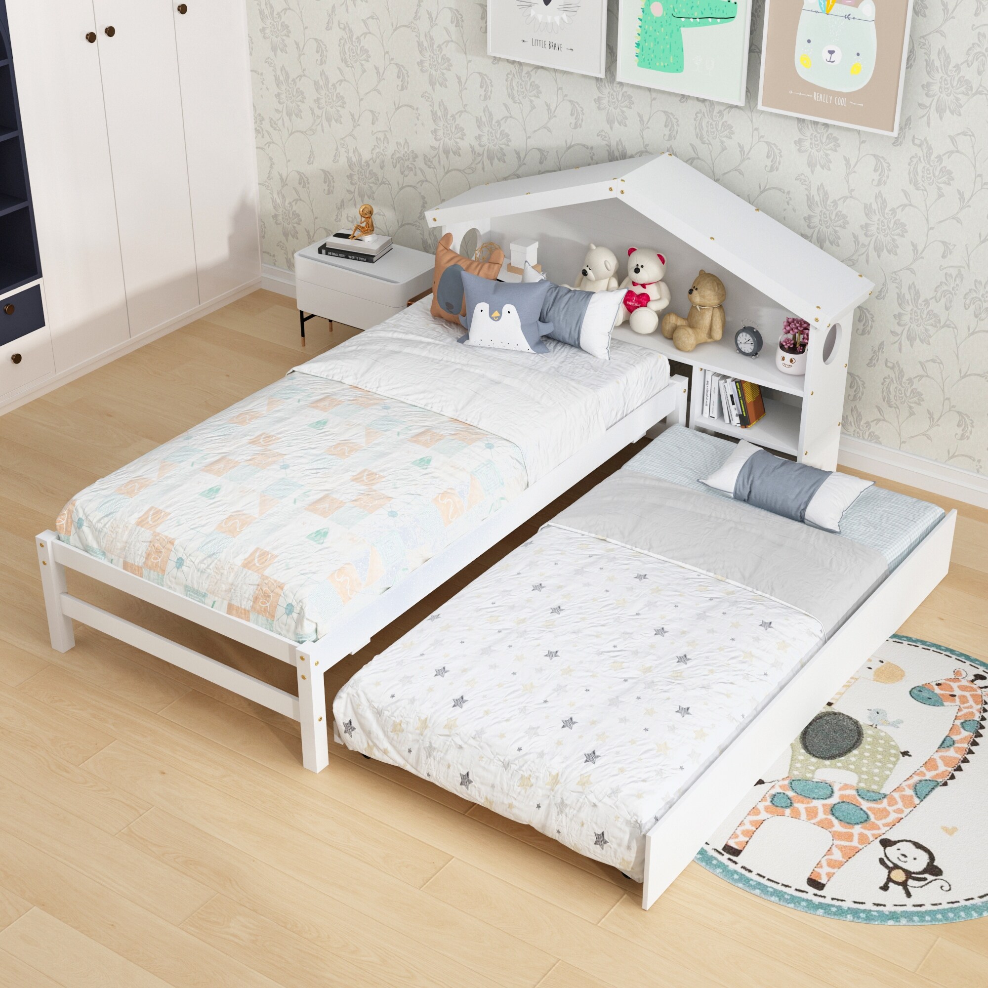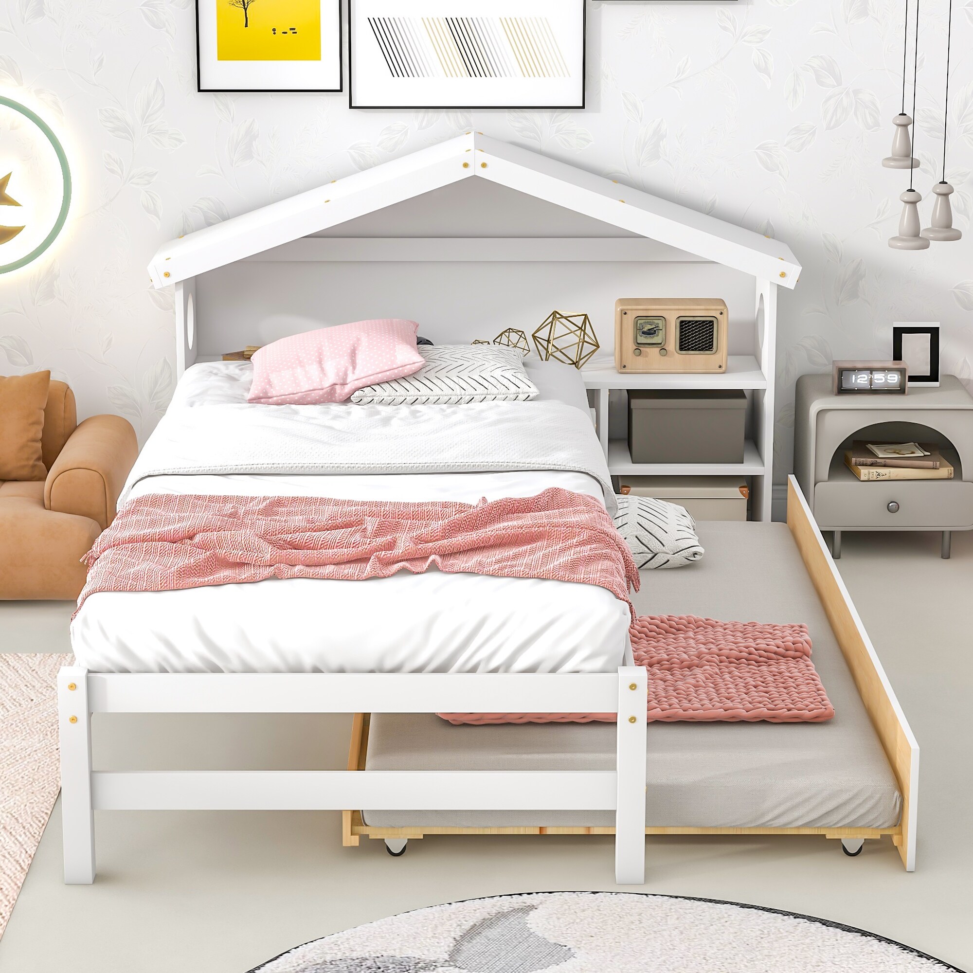 Twin Size House Bed with Bedside Table, Trundle