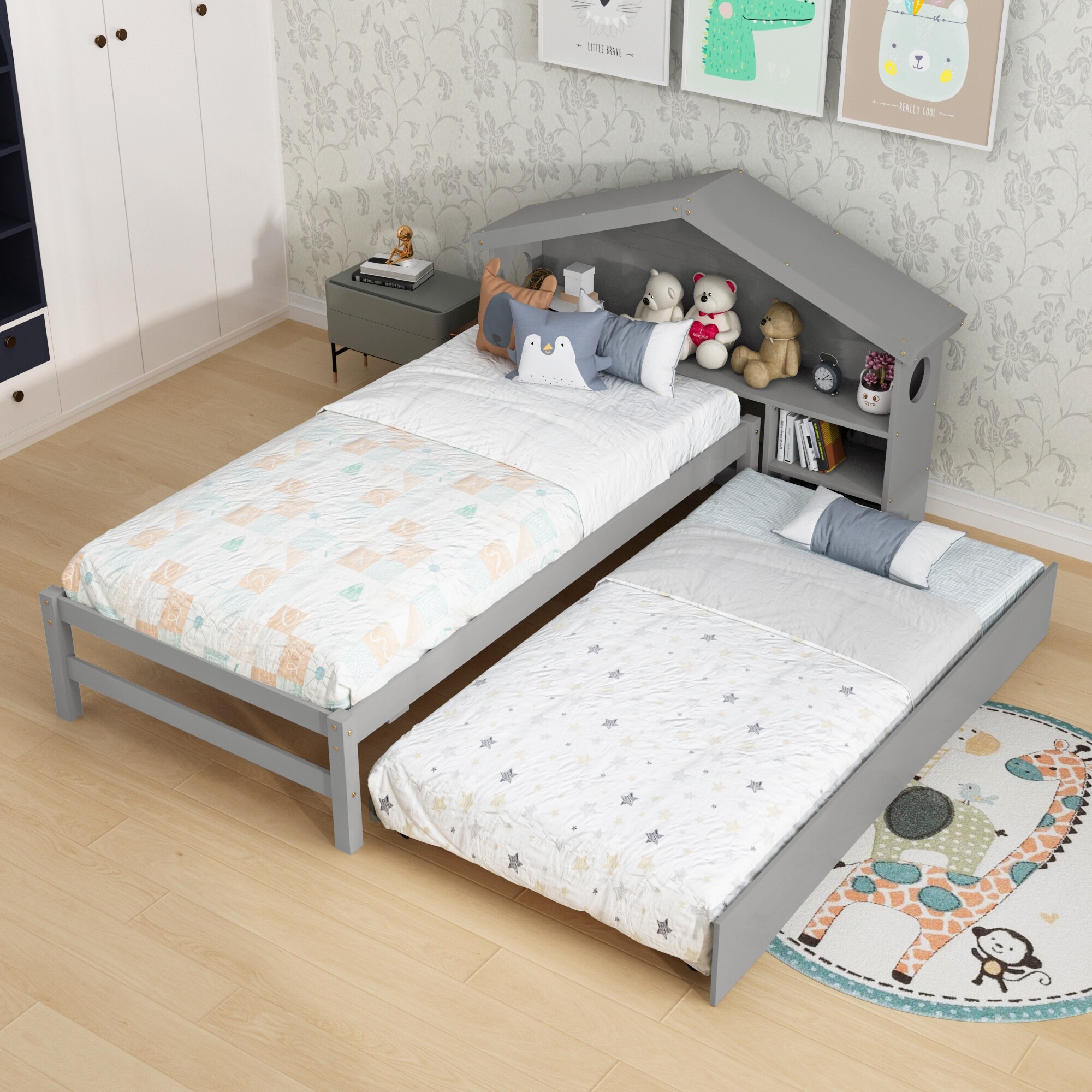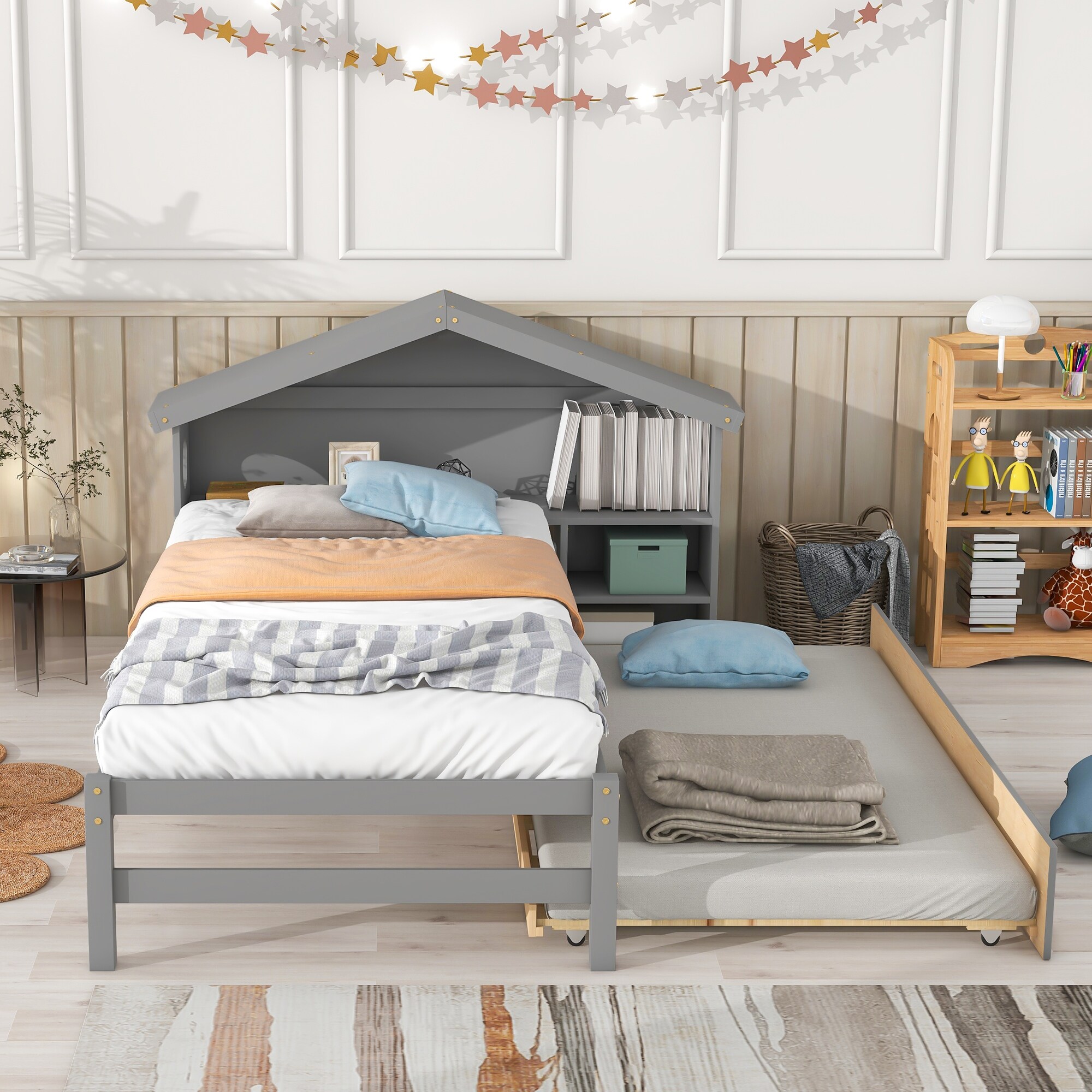 Twin Storage House Bed for kids with Bedside Table and Trundle