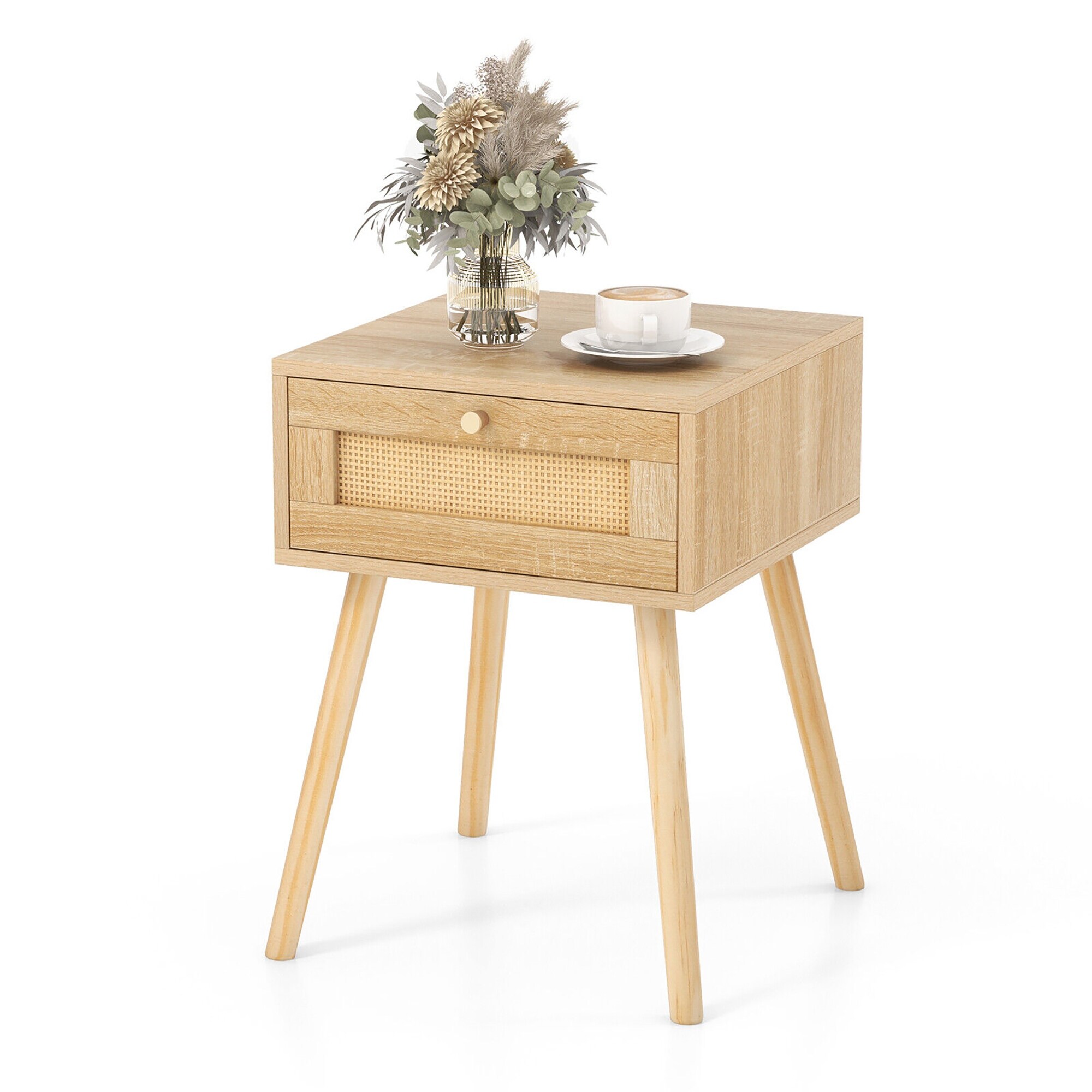 Gymax Nightstand Bedside End Sofa Table with Rattan Drawer for Bedroom