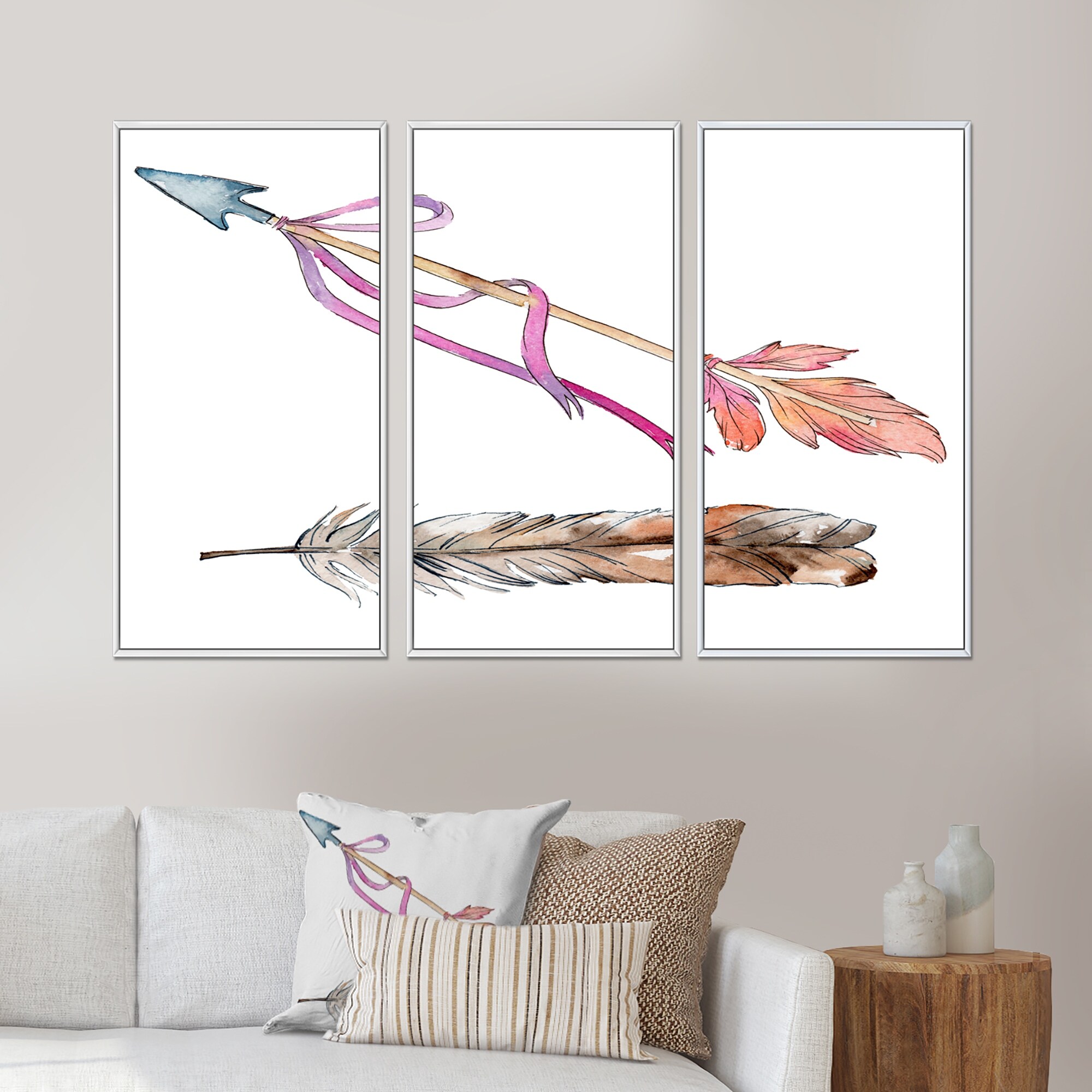 Designart "Pink Bird Feather From Wing" Bohemian & Eclectic Framed Artwork Set of 3 - 4 Colors of Frames